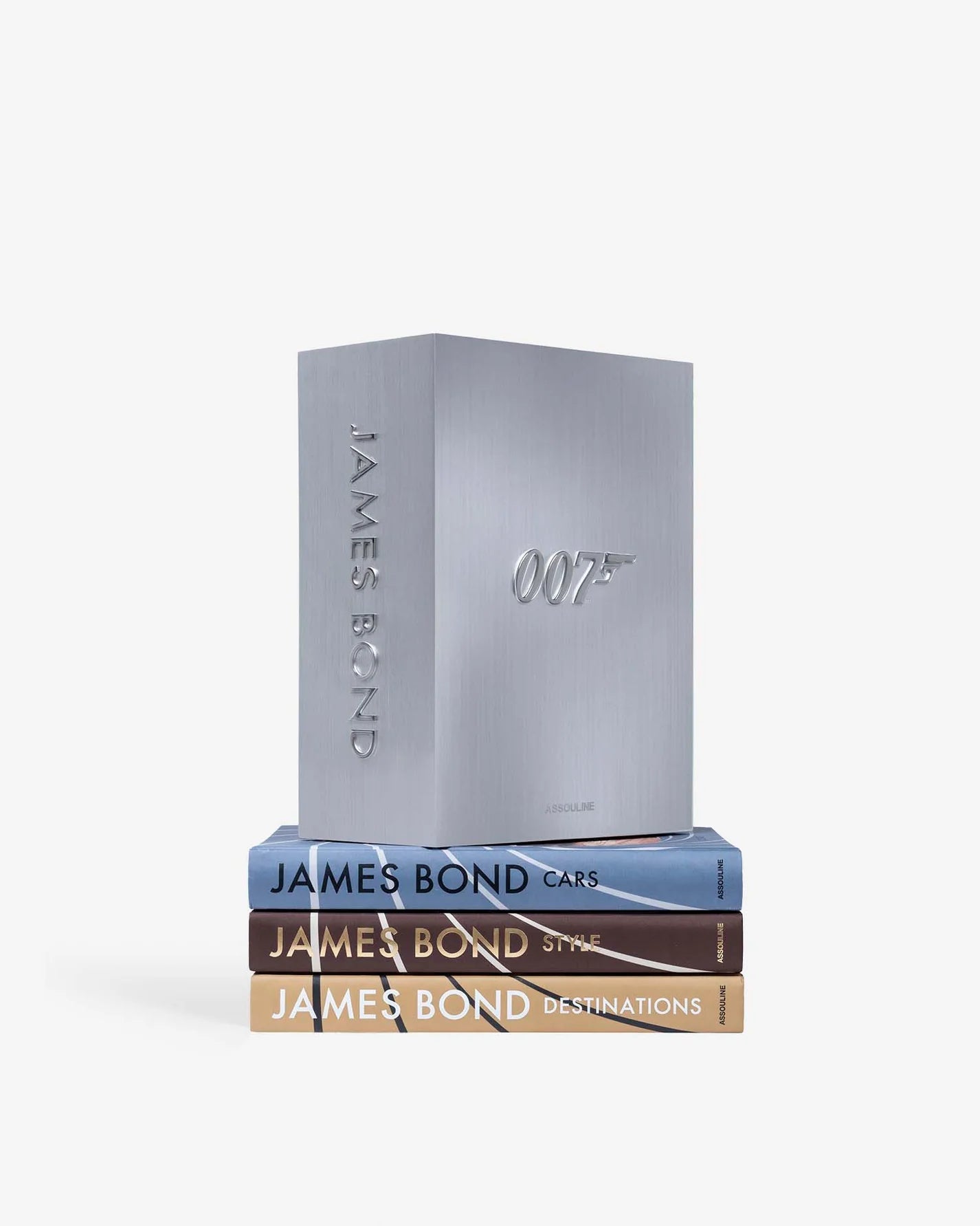 The James Bond Trilogy with Slipcase includes James Bond Cars, James Bond Destinations, and James Bond Style, presented together in a brushed aluminum slipcase inspired by the sleek design and innovation of 007’s world.