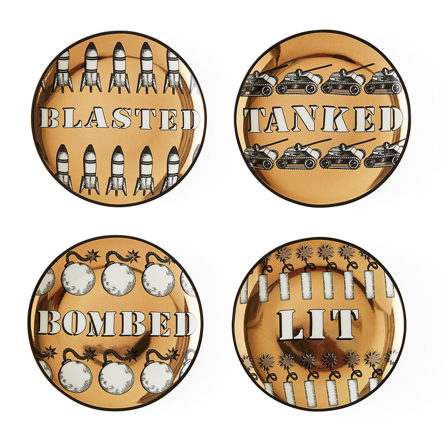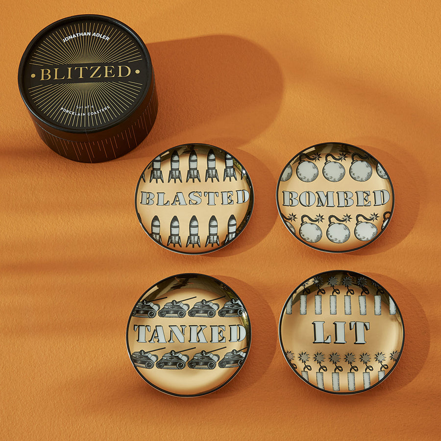 For the extra celebratory soirée, our Blitzed Coasters feature sparkly gold backdrops accented with boozy bon mots.