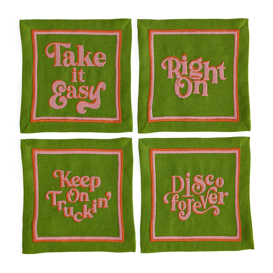 The perfect pairing with cocktails and canapés, these beauties even elevate basic bar nuts. Embroidered on luxe linen, our profound bumper sticker sentiments rendered in couture materials are just the bon mots to get guests talking.