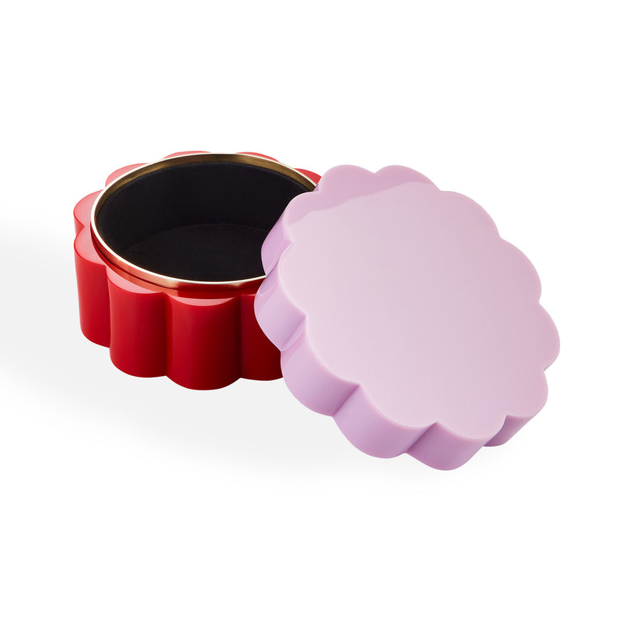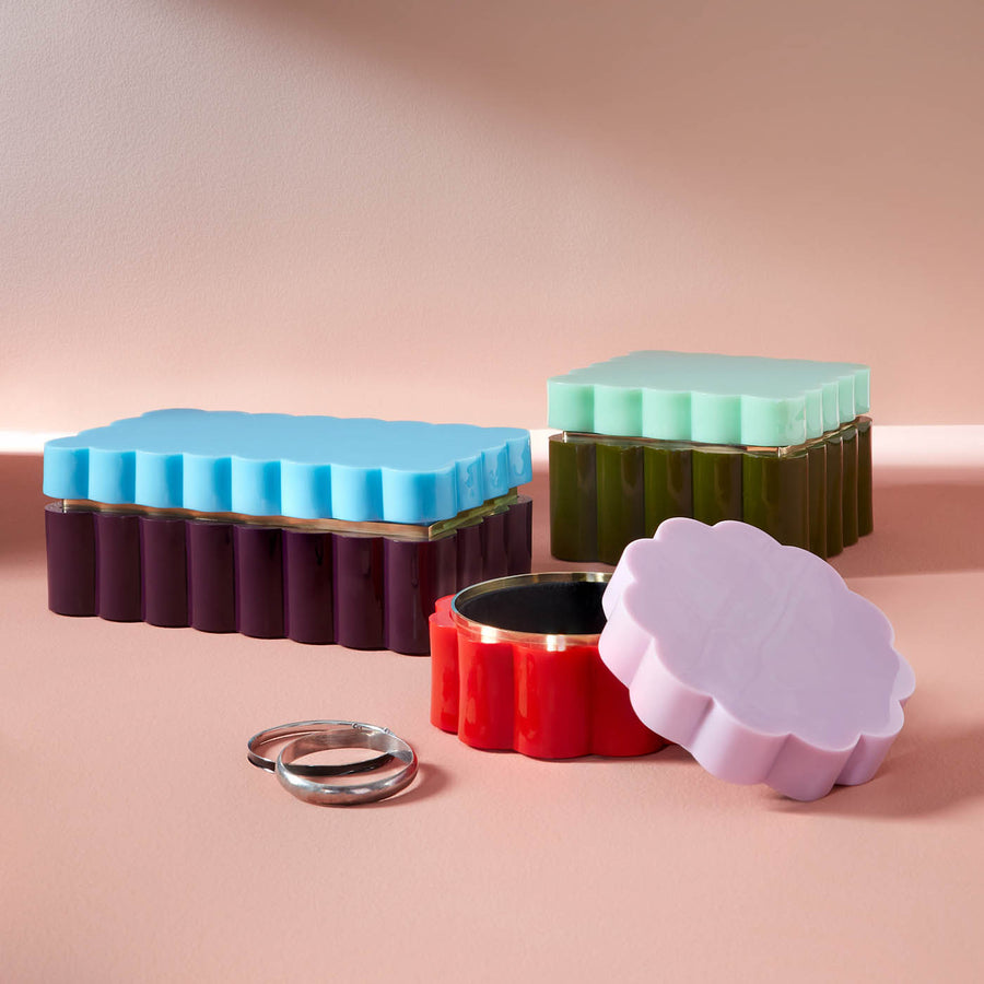Oversized, two-toned, and crafted from solid opaque acrylic with scalloped edges, our Fleur Boxes are just the dash of gemlike color your cocktail table has been begging you for. Available in three sizes, each box is hand-polished to a glossy finish and features a recessed brass reveal that cranks up the glamour. Fab solo or style all three together for extra wow.