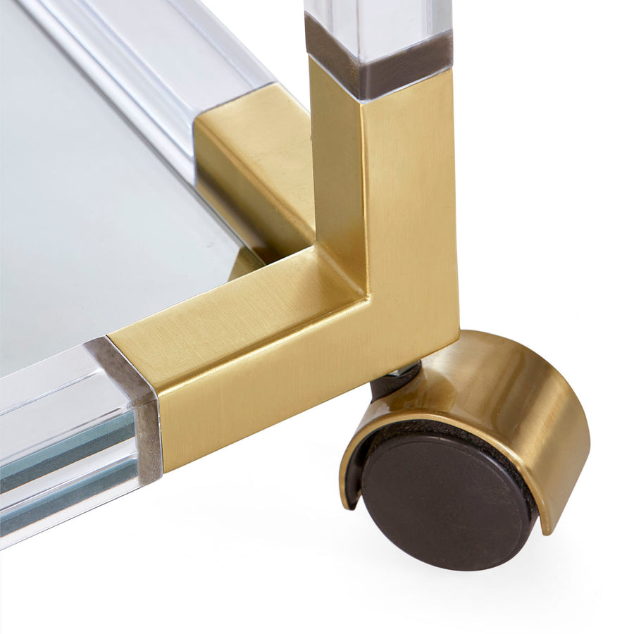 Clearly Cool. Our Jacques Bar Cart is what Jonathan calls "a real bar cart's bar cart." In luxe clear acrylic with brushed brass accents and featuring two glass shelves that offer plenty of space for your chosen aperitifs and accoutrements. The perfect blend of simplicity and glamour, modern and traditional. Big presence, weightlessly transparent.