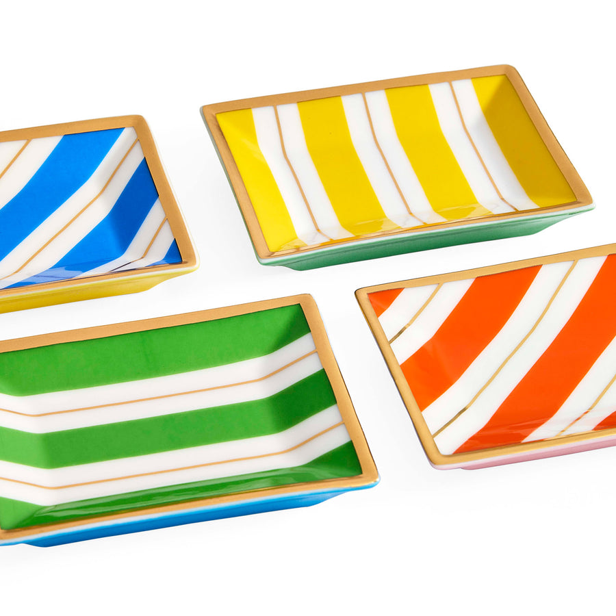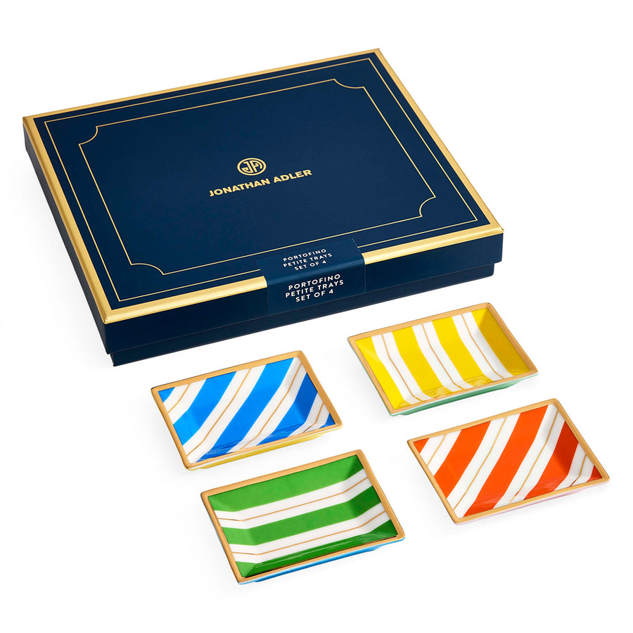 It’s true: stripes are forever and a pop of playful color is posh, posh, POSH. Featuring bright candy-colored stripes, our petite Portofino trays brighten your bedside, catch rings at the sink, or give any tabletop a très chic 'scape—just the little quelque chose you didn't know you needed but absolutely do. Crafted from high-fired porcelain and gilded with real gold accents. Indulge yourself or give them as a gift—every tray set comes packaged in a nifty box. Set of four.