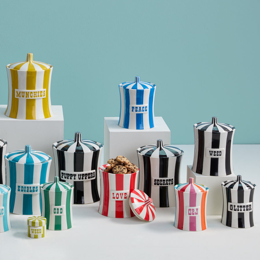 Guilty Pleasures. Celebrate life's little helpers. Our iconic canisters show off your indulgences, from sweets to sedatives, in irresistible hues: each high‐fired porcelain canister is hand‐painted with a graphic black and white or rich color finish. Cluster a few on your counter, keep one bedside for late‐night cravings, or go wild and collect them all.
