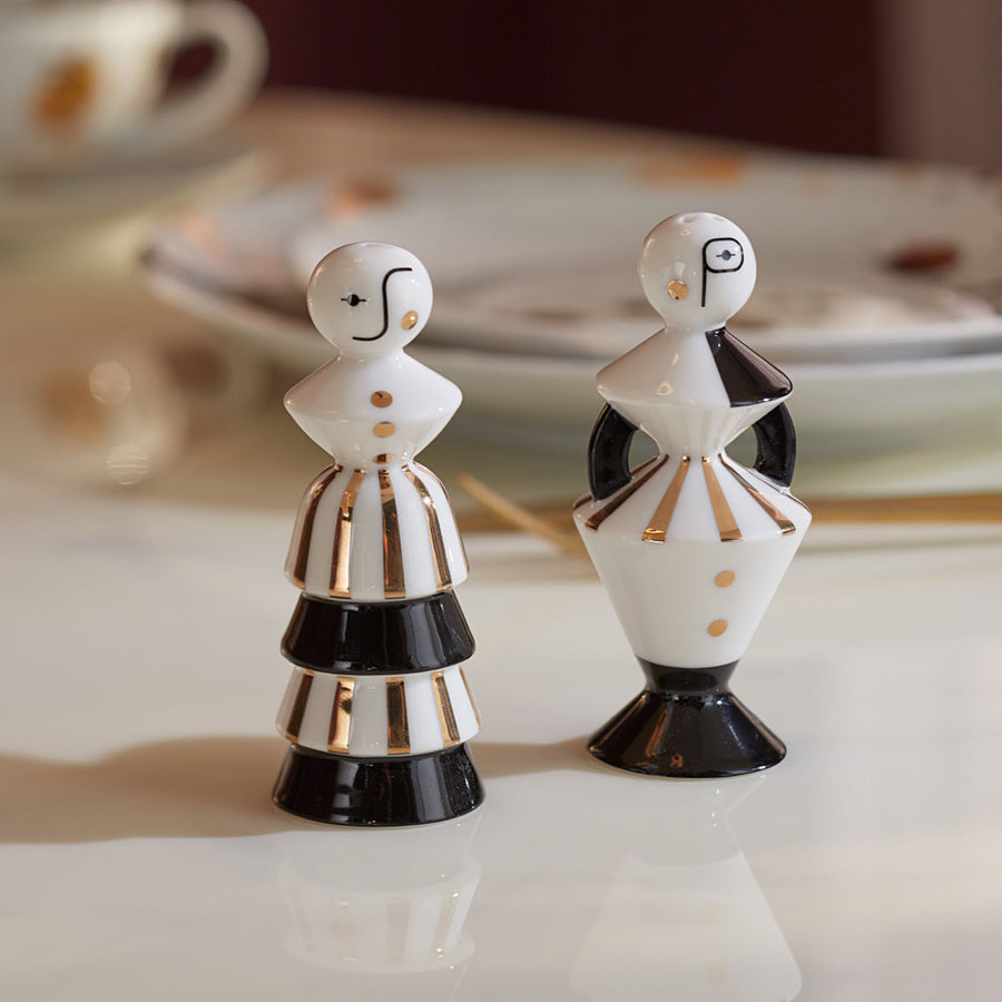 Shake things up with a dash of Deco, a nod to Memphis, and a hint of Russian Constructivism. Our Vienna Salt & Pepper Set features pared down black and white forms handcrafted in high-gloss porcelain with pure gold accents. Packaged in a fetching box, they’re perfect for gifting and storing.
