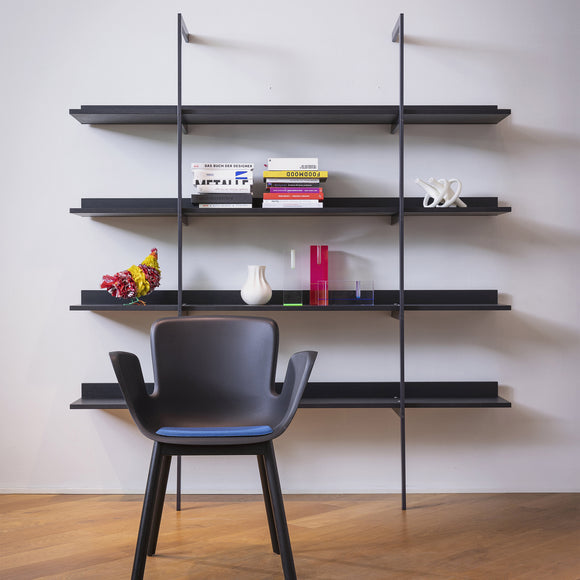 Upgrade your living space with the stylish and versatile Aliante Bookcase from Cappellini. Available in classic black to suit any interior, this versatile storage design creates ample space for decor display or chic storage in any living space. The metal structure and wooden shelves provide durability while adding a touch of sophistication. Personalize the visual impact and easily attach the bookshelf to the wall for a functional and modern addition to your home.