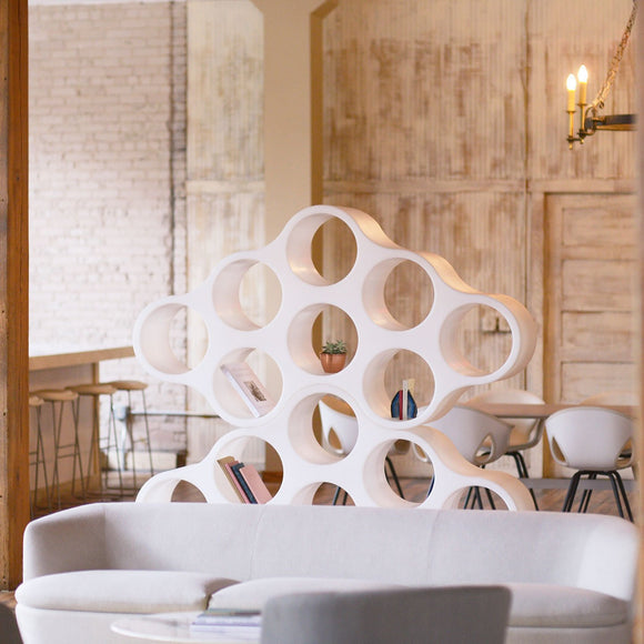 Make a bold statement in your living room, lounge, or office with the Cloud Bookcase from Cappellini. Cloud is a modular, double-faced bookcase that adds visual lightness as a storage bookcase or space divider. The Cloud's distinct shape allows for either horizontal or vertical orientation, and the 9-compartment module can placed individually or combined with other Cloud modules to form a larger configuration. This bookcase is designed to showcase favorite objects, books, bottles of wine & more. It can also be styled as playful storage display within a kid's room, media room, or game room.