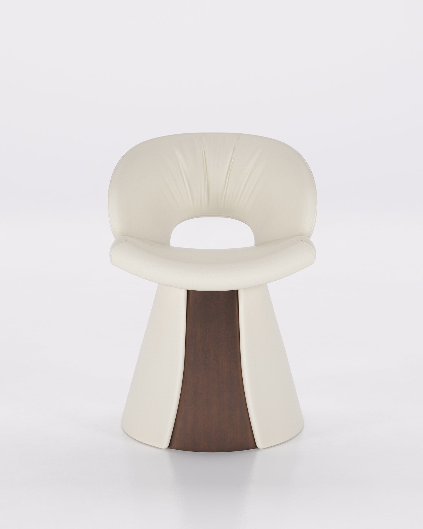 CS LAB's inventiveness and creative investigation came together to create the unusual and distinctive chair known as Dafne, which features a perforated backrest. The intricate intricacies and meticulous craftsmanship are evident in the architecture of the cone-shaped base and body. Choosing from an extensive selection of leather and textiles, the upholstery envelops the base like a cloak, exposing a beautifully crafted metal breastplate upfront of the backrest's elliptical hollow.