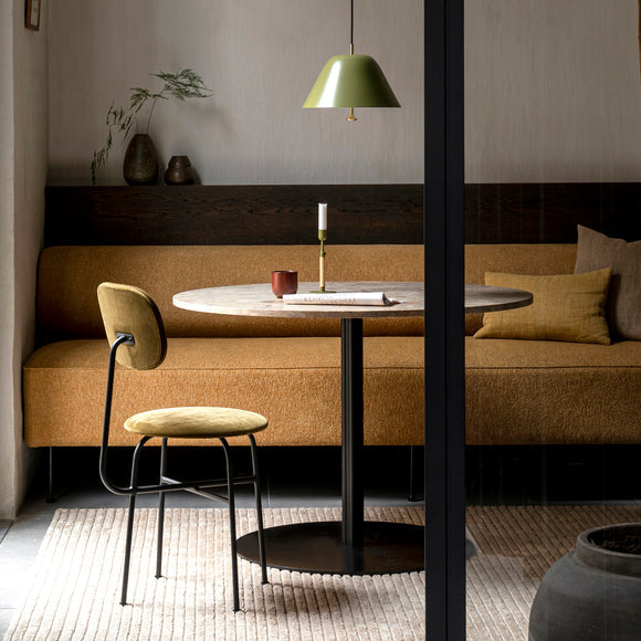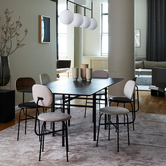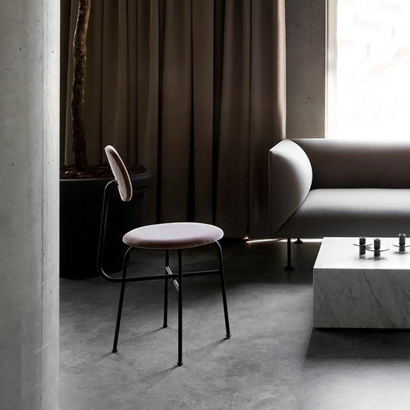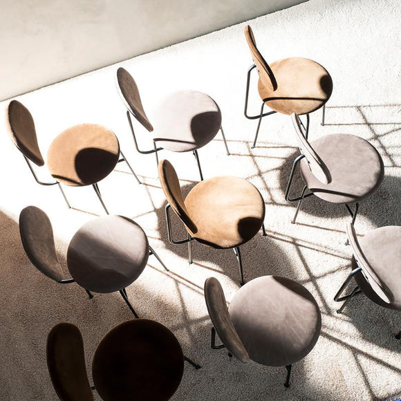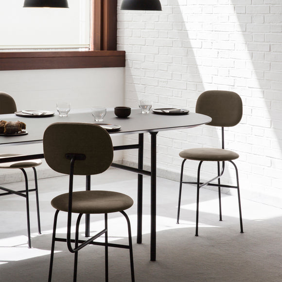 A minimalist bar chair with Asian meets Danish influence, the Afteroom Upholstered Dining Chair Plus by Menu Design now Audo Copenhagen is an artful expression of measured design. The taut upholstery and smooth, definitive lines make up the construct for a high quality appearance. Perfect for a cozy kitchen nook or casual sitting area, the high backseat is a luxurious and comfortable seat upholstered with Italian leather.