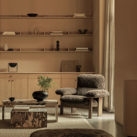 Designed for relaxation, inviting long periods of rest with its soft and sweeping form, the Brasilia Sheepskin Lounge Chair by Menu Design now Audo Copenhagen brings the beauty of Scandinavian craftsmanship to your well-appointed home. Offering unparalleled sitting comfort thanks to its bold frame and plush upholstery, this chair makes an impression with the clean Scandinavian-inspired silhouette and modernist shapes.