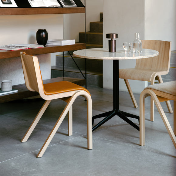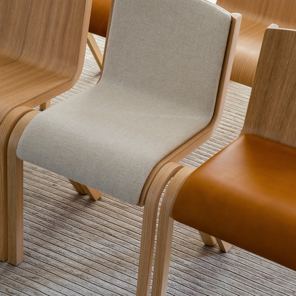 Deceptively simple in its design yet featuring a wealth of details, Ready’s cantilevered seat and backrest appear as if suspended on air. Curved anterior legs add to the sense of lightness while visible joints draw the eye. Shaped from FSC™-certified oak veneer. As an added feature, the upholstery can easily be changed by loosening 4 screws. Row Connection allows you to join individual Ready Dining Chairs together in a line, making it ideal for use in conference facilities.