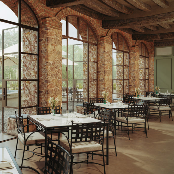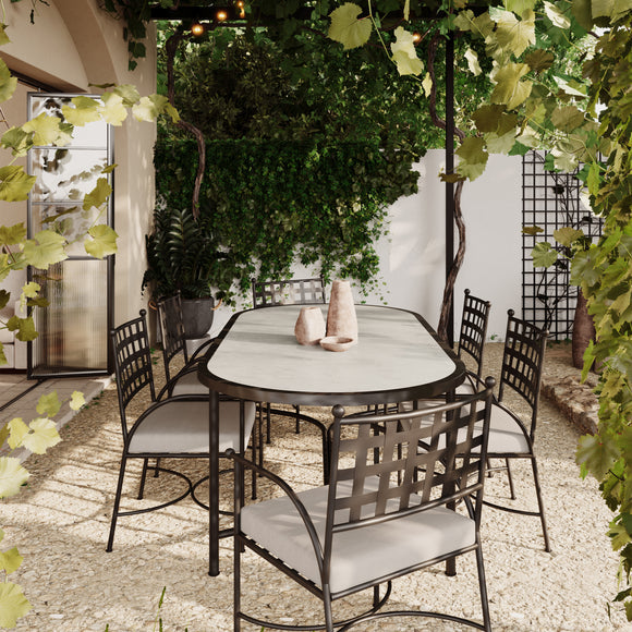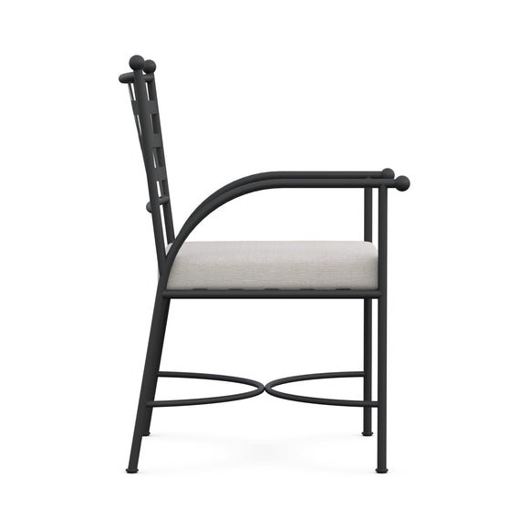 The Athens Dining Chair from Azzurro Living combines European-inspired elegance with timeless design. Featuring sculpted wrought iron accents and refined finials, this chair offers exceptional comfort through its soft, durable performance fabric. Expertly crafted with intricate detailing, it embodies a sophisticated cottage chic style that harmonizes classic refinement with modern ease.
