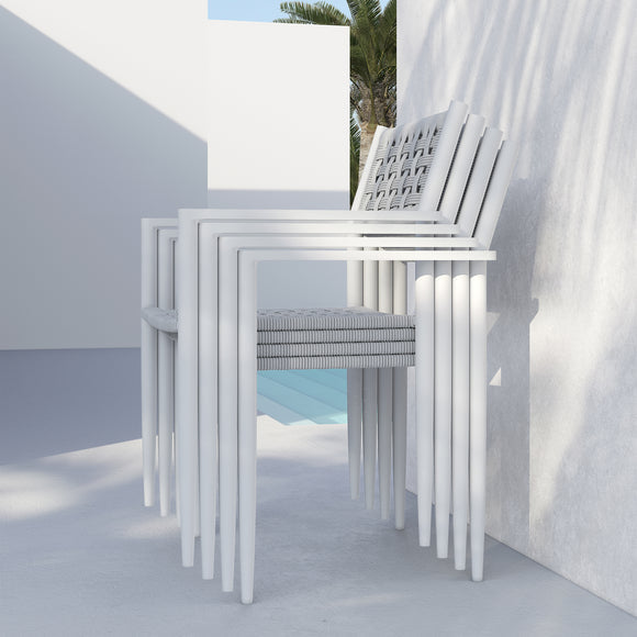 Offering a solution that is both great in function and leisure, the Naples Dining Chair (Set of 2) brings a contemporary touch to your outdoor dining space. Offering a tapered powder-coated aluminum frame, the seat and back of the chairs are crafted from handwoven all-weather rope, bringing an elevated touch to your traditional dining area. The stackable design makes storage a breeze when not in use and offer a space-saving solution when storing in the off season. Subtle, yet sophisticated, these chairs are ready to bring a luxe touch to your outdoor space and offer a stylish seating solution all season long.