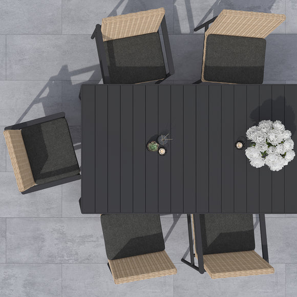 The Terra Armless Dining Chair (Set of 2) from Azzurro Living brings a traditional, yet sleek addition to your outdoor dining space. Featuring a matte charcoal aluminum frame, the all-weather wicker body of the chair is handwoven by artisans for an elevated touch of style and function. Steeped in simplicity, this chair is inspired by mid-century modern design and is topped with a high-density foam cushion wrapped in Solvita Performance Fabric upholstery for easy maintenance and protection from staining and UV rays. Pair with a complimentary woven rattan table for a cohesive look or go bold and industrial with a concrete-topped table for a look that is all your own.