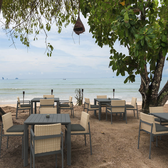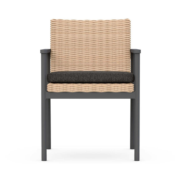 A simple, yet impactful design, the Terra Dining Chair (Set of 2) from Azzurro Living brings a mid-century modern inspired touch to your outdoor dining space. Featuring a matte charcoal aluminum frame wrapped in handwoven all-weather wicker, this dining chair brings an organic, yet sophisticated touch to your favorite patio dining table or back deck destination. Topped with a high-density foam cushion wrapped in Solvita Performance Fabric upholstery, this chair is ready to take on the elements in style. This chair works perfectly situated around an aluminum dining table to create a cohesive look for the outdoors. Or utilize these chairs as additional poolside seating and top with your favorite outdoor pillow for a pop of color and an added touch of comfort.