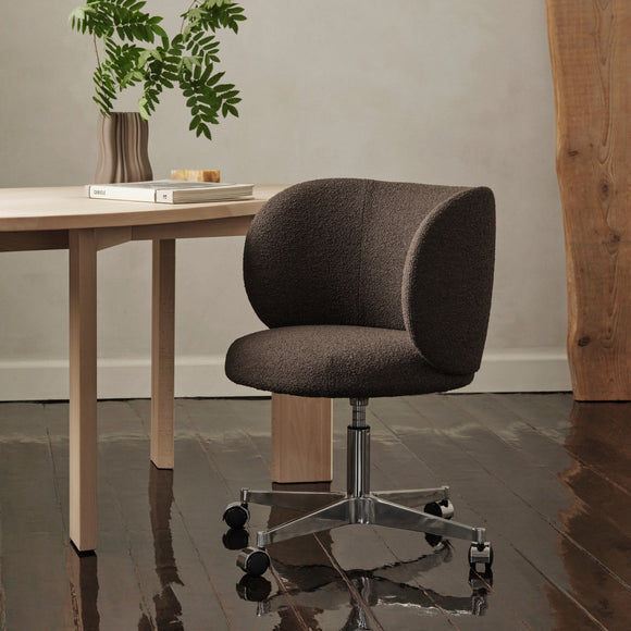 Defined by its soft lines and a modern, voluminous expression, the Rico Dining Chair from Ferm Living brings a new level of comfort to the table. This elegant chair features a sturdy inner structure of steel and FSC™-certified wood, which is then enveloped in a comfortable molded foam. Upholstered in a unique and textural Devoré Velvet, its embracing, curvy form provides an inviting sit. Set on a polished aluminum base with smooth-rolling castors, it offers effortless mobility, making it a sophisticated and versatile choice for the modern dining room or workspace.