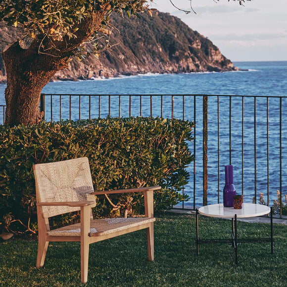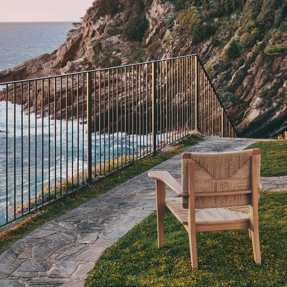 Upgrade your outdoor lounging experience with the F-Chair Outdoor Lounge Chair from Gubi. Designed by French designer Marcel Gascoin, this chair is expertly crafted with natural and durable teak, perfect for long-lasting use. The nautically inspired, handwoven cord seat and back adds a touch of style and comfort. Enjoy indoor and outdoor relaxation with this versatile piece.
