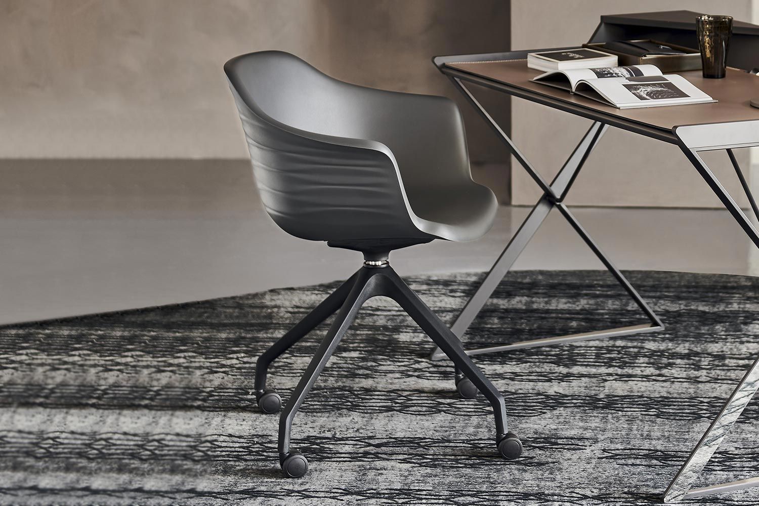 The Indy 4 Spokes dining chair is a fun solution that encompasses innovative materials. With a slightly curved back and armrests, it provides ergonomic support to promote proper posture. By having contrasting finishes on the seat and back, it creates a vibrant juxtaposition for a complementary touch. Pair with a variety of grand Cattelan dining tables to form a cohesive look. Manufactured in Italy by Cattelan Italia, the Indy 4 Spokes dining chair is made using soft polyurethane. It is available in various single colors as well as in one dual color version, and the base comes in an array of metal finishes. Two versions are available in a swivel version or one on wheels. Fireproof seat 1 IM - CRIB5.