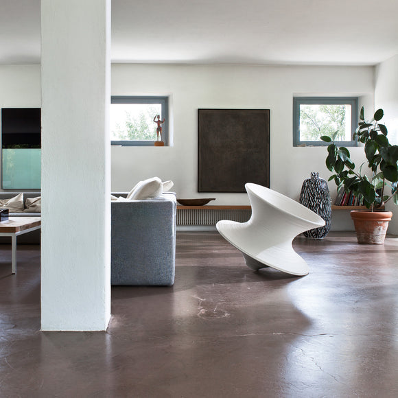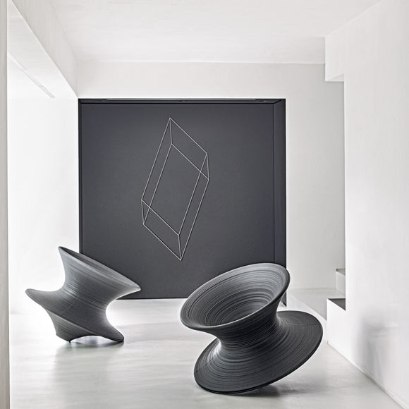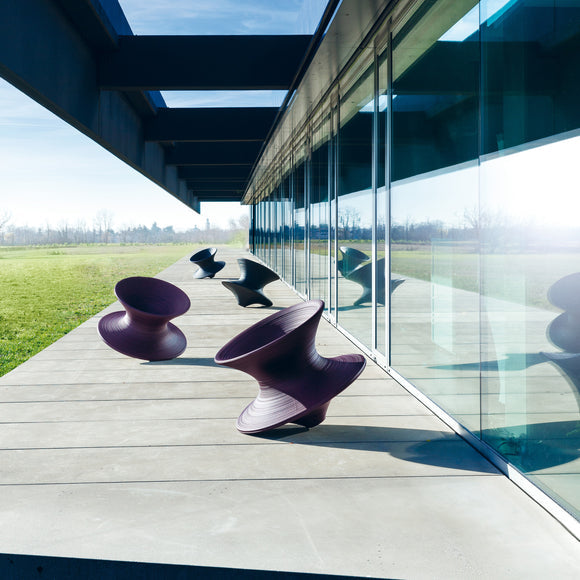 Experience outdoor living with the unique and whimsical Spun Outdoor Rotating Chair from Magis. Created through rotational molding techniques, this Thomas Heatherwick-designed piece is crafted with durable polypropylene for indoor and outdoor use. Thanks to its pointed base, when leaned on its side, it becomes a one-of-a-kind chair you can spin around in or rock from side to side.