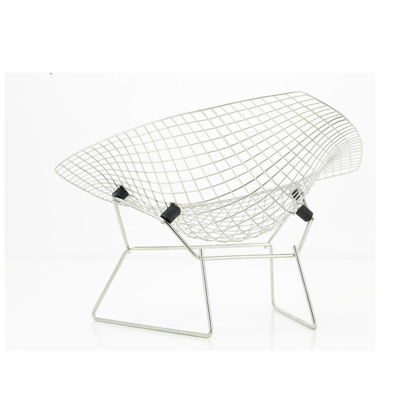 Diamond Chair clearly separates the different functions of the chair: the transparent wire shell is bent out of a quadratic lattice into an organically shaped diamond like a net frozen in space, and the base of round iron embraces it like a polished diamond. In chairs many functional problems have to be solved first, but basically chairs are also studies in space, form and metal. On close inspection it becomes clear that they are mostly made up of air. Space flows right through them.