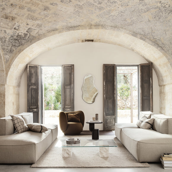 A harmonious marriage of natural materials and contrasting finishes, the Mineral Coffee Table showcases the intrinsic beauty of stone and glass. The smooth, rectangular glass top is placed on a base of two stone blocks – each with one end of which is left unfinished for a raw, textural look.