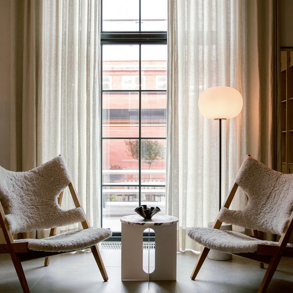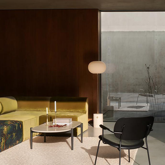 Inspired by the form and beauty of traditional oil lamps, the JWDA Floor Lamp by Menu Design now Audo Copenhagen brings elevated illumination to any corner of your home. Crafted from contrasting materials, the elegantly balanced design is a lesson in refinement and a study in geometry. With an elliptical opal glass shade, a slender metal stem, and a rectangular marble base, this floor lamp showcases artistic engineering and well-thought out construction. Outfitted with a dimmer switch, this floor lamp is a timeless addition to any modern living space.