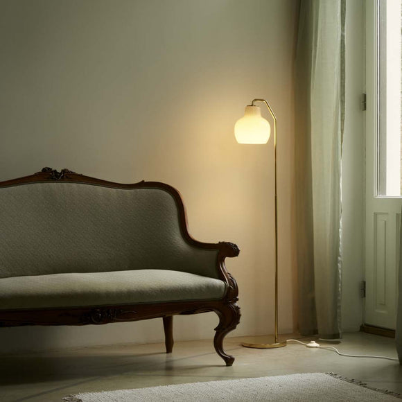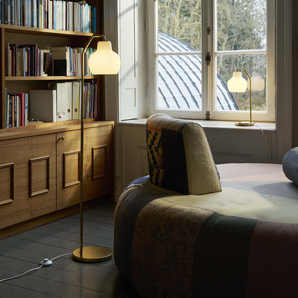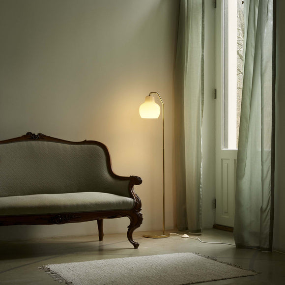 An elegant and sculptural icon of Danish modernism, the VL Ring Crown Floor Lamp from Louis Poulsen brings a 1940s Vilhelm Lauritzen design to the modern interior. Expertly crafted, this piece features shades of mouth-blown, triple-layered opal glass that provide soft, glare-free illumination. The slender frame is constructed from untreated satin polished brass that will develop a unique patina over time. A true piece of Danish design heritage, it brings timeless character and warm, inviting ambiance to any living space.
