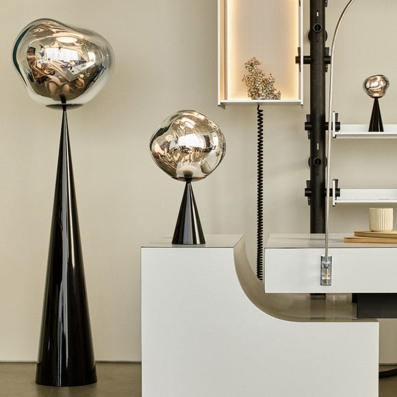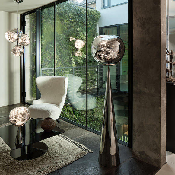 The Melt Cone Fat LED Floor Lamp from Tom Dixon showcases a unique design creating a mesmerizing effect that evokes the beauty of artfully crafted molten glass. Using a process of blow molding and vacuum metallization, it creates radiant orbs that will light up any room with an organic and scene-stealing glow. Melt will bring a sense of tasteful sophistication and exclusiveness to your home.