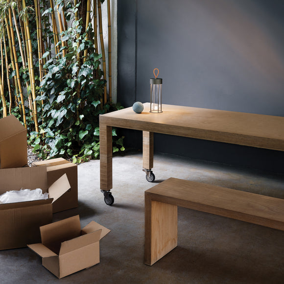 Lighting device for exterior ground installation. The opalescent diffuser is integrated in the head and outer protective glass in transparent borosilicate. The structural parts are made of die-cast and extruded aluminum treated with a chemical conversion process to protect against atmospheric agents. The body is powder-coated with a range of available finishes. Integrated LED light source with Edge Lighting technology to guarantee perfectly uniform lighting. The portable version is equipped with a handle for transport.