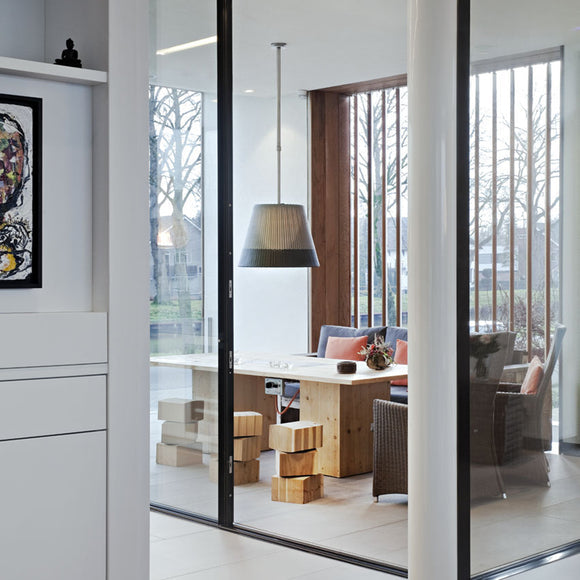 Part of the Romeo family by artist Philippe Starck, the Romeo Outdoor C3 moves the eye upwards with a balanced refinement. The outer diffuser is made by weaving colored PVC tube compound with the polyester painted, phospho-chromated aluminum inner tubular frame. The inner diffuser is opal colored, vacuum-formed PC (polycarbonate) that can be removed without tools when the bulb needs to be changed. The diffuser support in anodized and painted die-cast aluminum alloy. The ceiling fitting is die-cast aluminum alloy with a brilliant finish. There is an injection-molded PC (polycarbonate) cover rose. The polished steel stem is 31.5". All painted details have undergone a galvanic phospho-chromate treatment for enhanced corrosion and weather resistance.