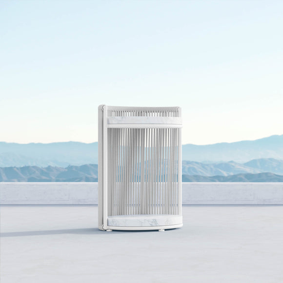 Elevate your outdoor lounge space and bring a sleek touch to your ensemble with the Brighton Side Table from Azzurro Living. The aluminum frame is lovingly hand-woven in all-weather rope, topped with a Carrara marble top and base, offering a touch of contrast to create a stand-out piece of luxury furniture. Ready to be topped with glasses of your favorite wine and appetizers to share with friends and family, this table is easily paired with sleek club chairs or reclining lounge chairs to create an outdoor spot worthy of royalty.