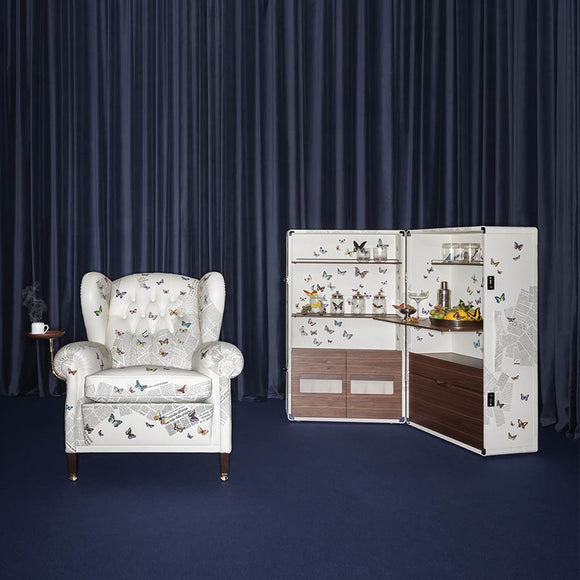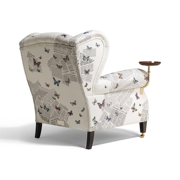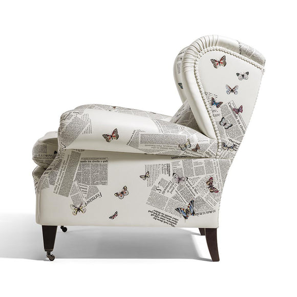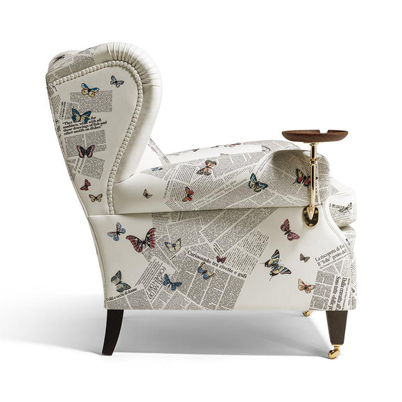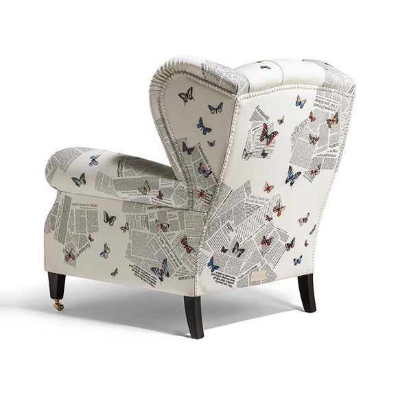The 1919 Ultime Notizie Armchair from Poltrona Frau combines grand proportions with exquisite craftsmanship. Its solid seasoned beech frame supports hand-applied Pelle Frau® Leather, featuring pleated volutes on the armrests and the signature capitonné backrest. Adorned with Fornasetti’s iconic "Ultime Notizie" print—a delicate trompe-l'œil of butterflies over vintage newspaper clippings—this bergère is a refined statement of comfort and artistic elegance.