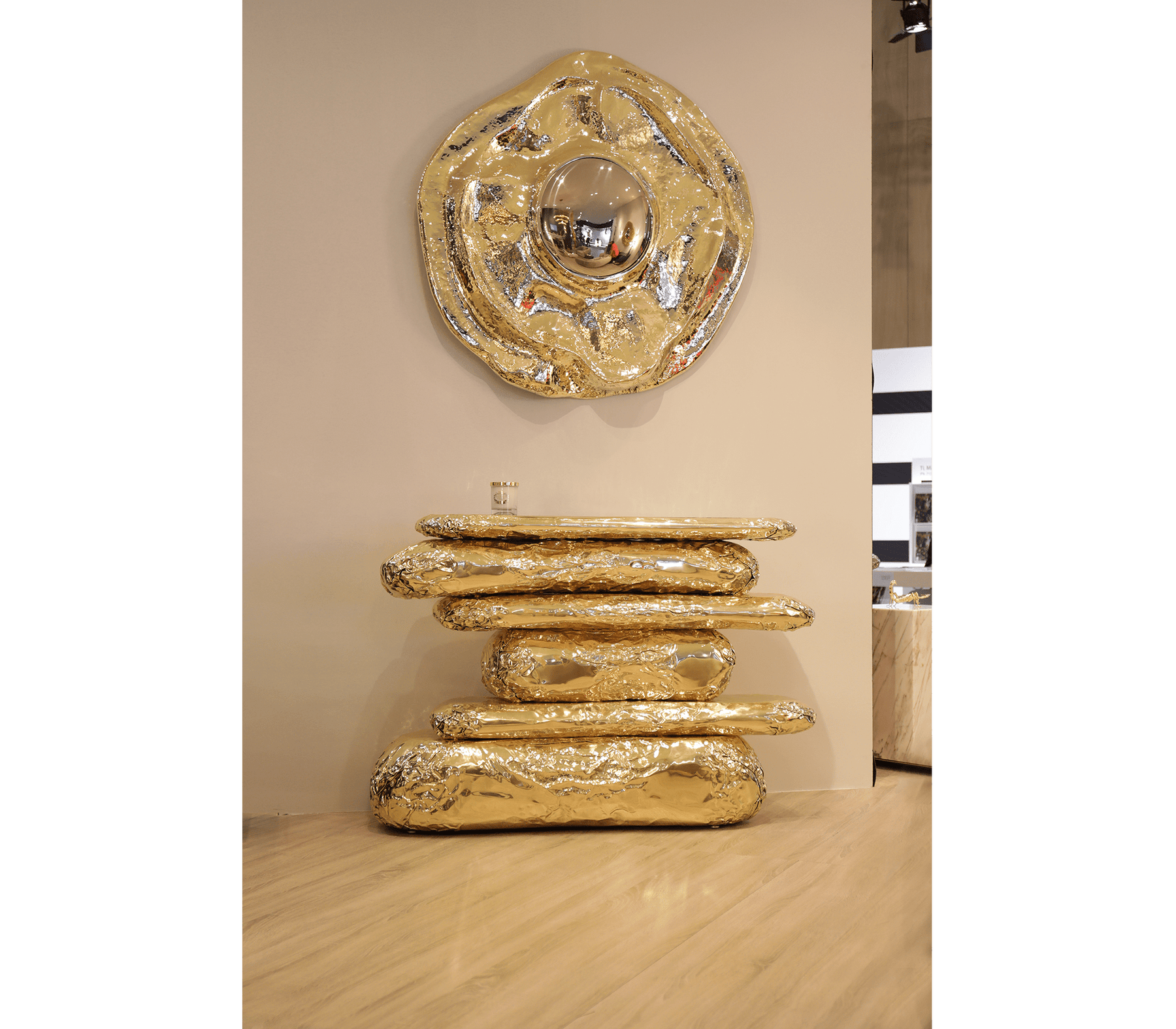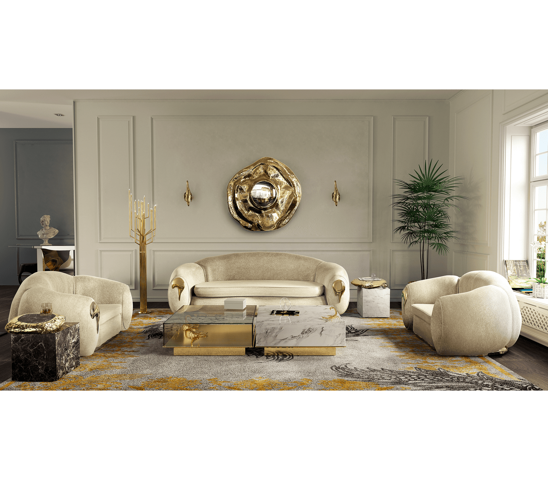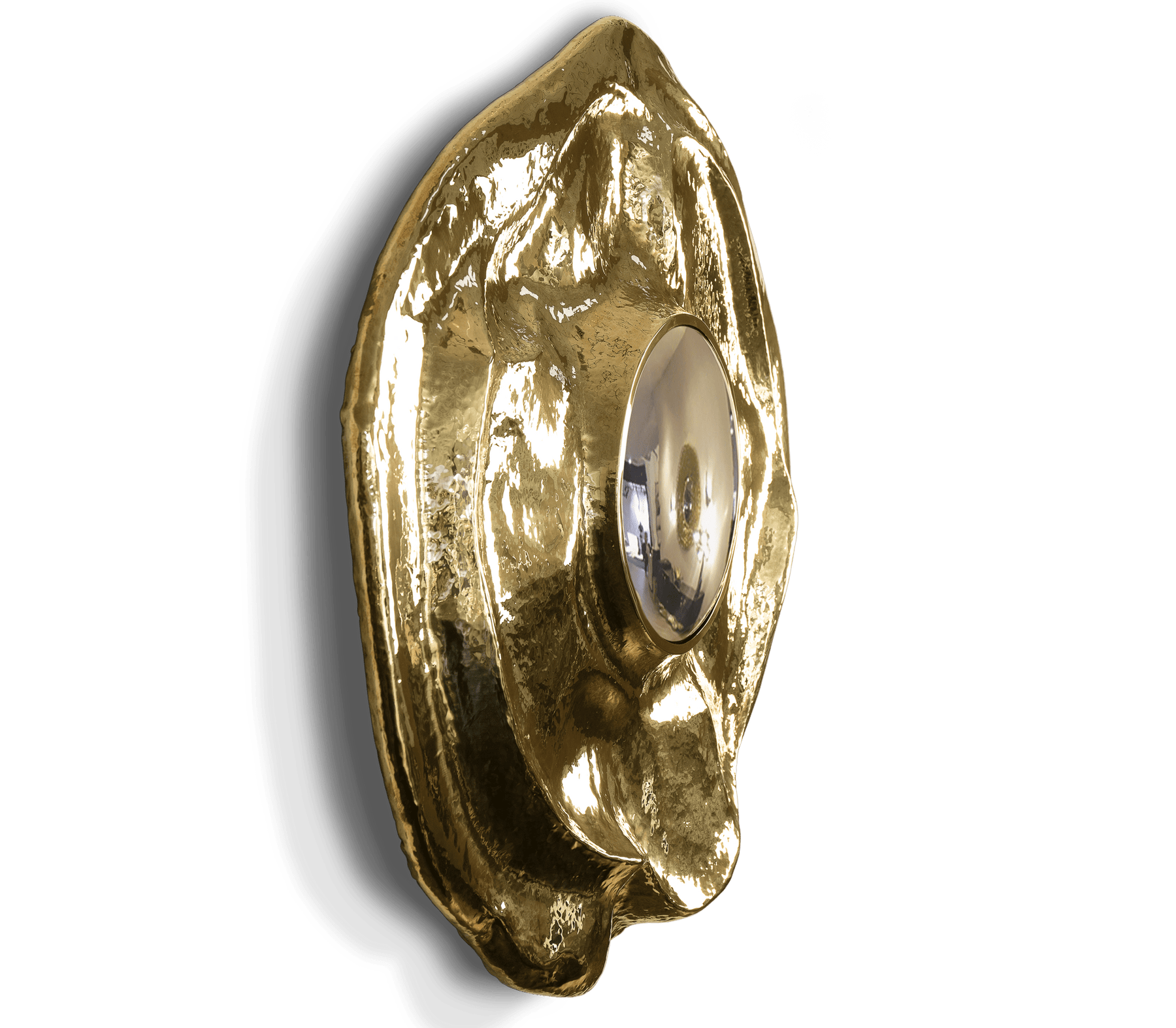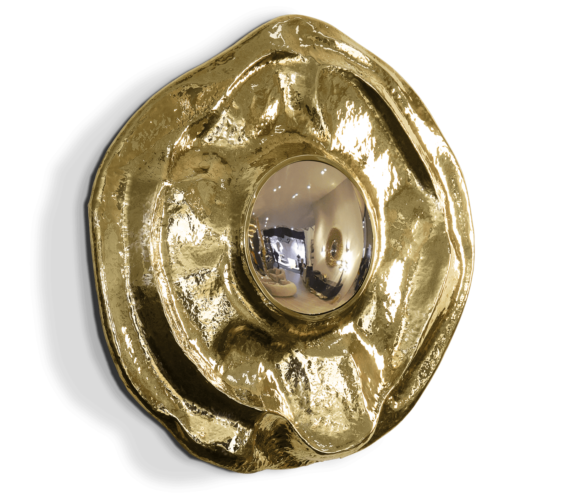 This large wall mirror offers a tribute to the historical city of Angra do Heroísmo in Azores, Portugal. The seductive and elegant mirror, it's outstanding in its shape and curved design. The polished brass creates a superb accent providing a glamorous design.