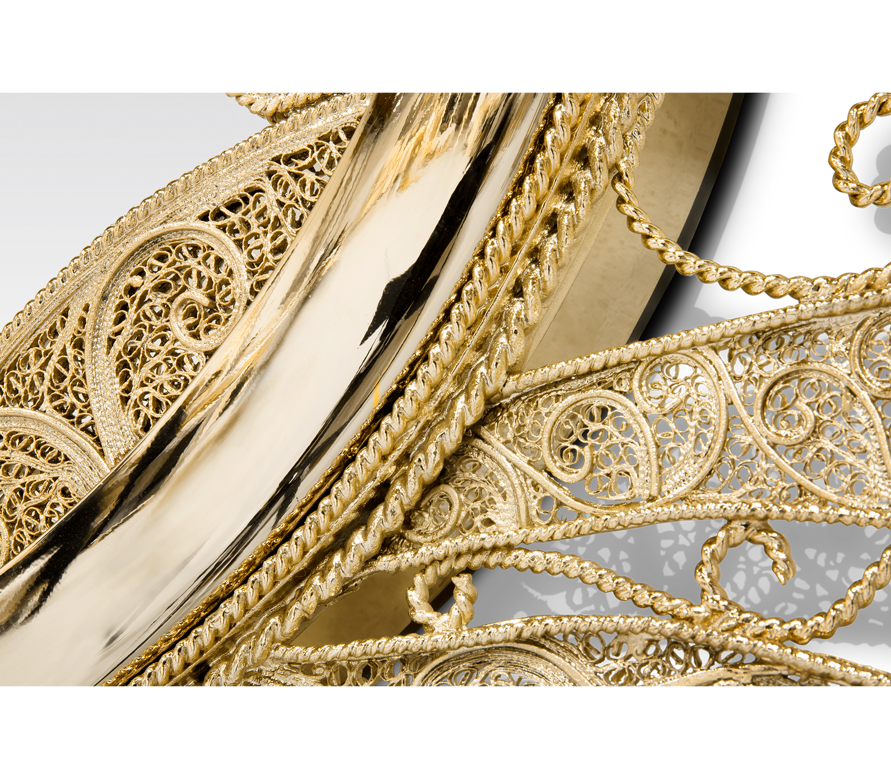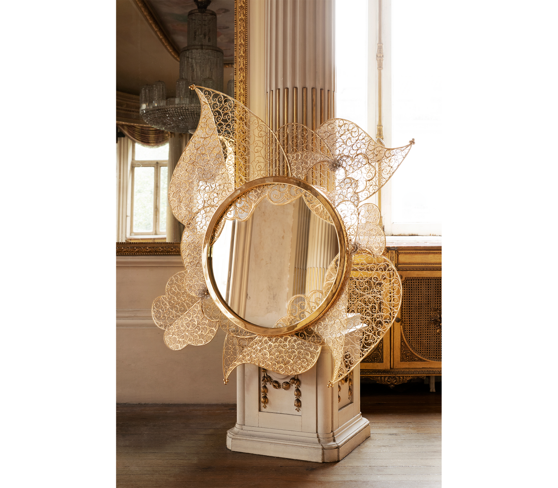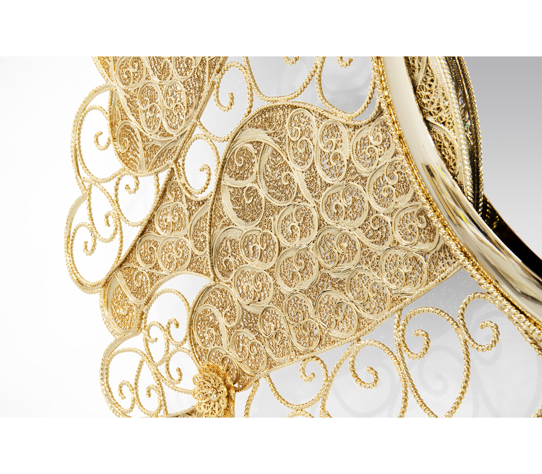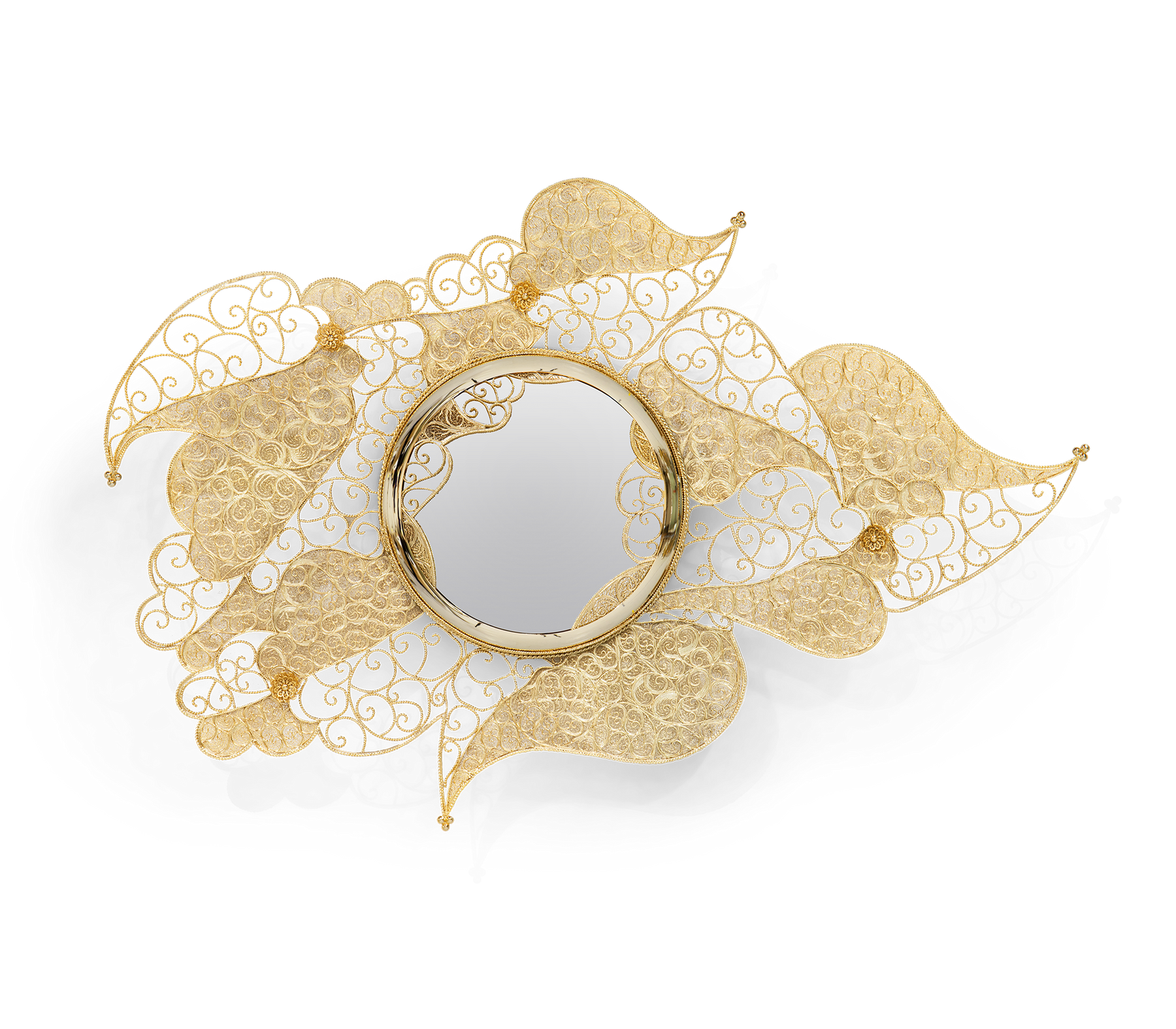 The Filigree Mirror resorts to one of the oldest jewellery making techniques known. Completely handcrafted, with each brass cord fitted with precision, the Filigree Mirror flourishes in a shape traditional to Portuguese culture and art. A true work of art, this luxurious mirror plays tribute to Boca do Lobo's core values heritage and craftsmanship. The Filigree mirror's structure is made from brass cords, gilded in 18k gold. It features a brass sheet that is hand-hammered to achieve its concave shape. A jewelry technique used to solder tiny beads and twisted threads. Filigree is the most delicate technique used to work precious metals, usually of gold and silver. It is an age-old and detailed jewelry expression in which skilled artisans painstakingly solder tiny beads and twisted threads to create striking artistic motifs, suggesting often exquisite and intricate lace-like patterns.