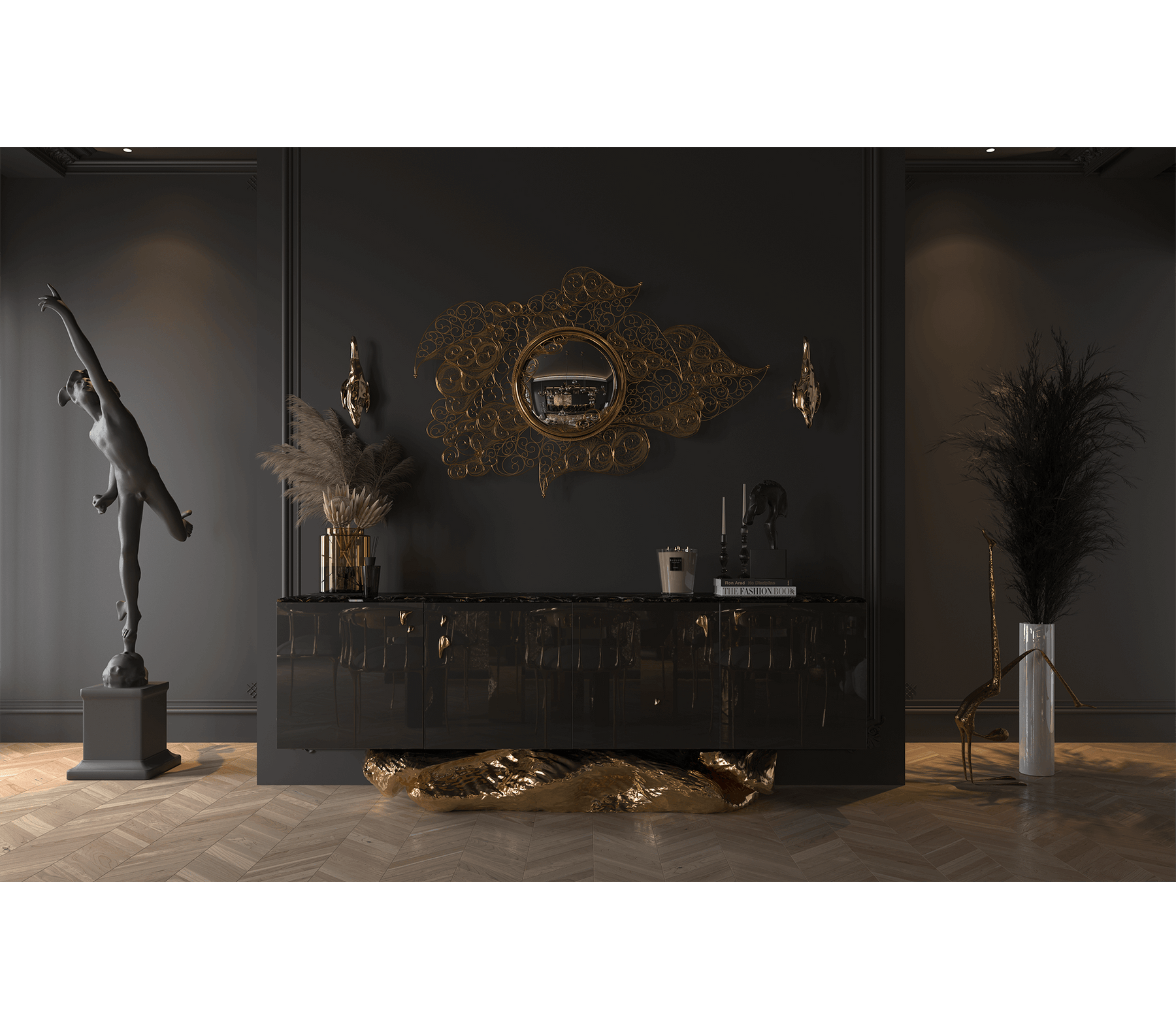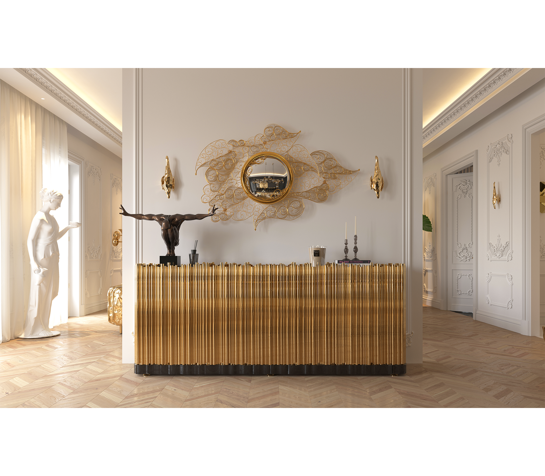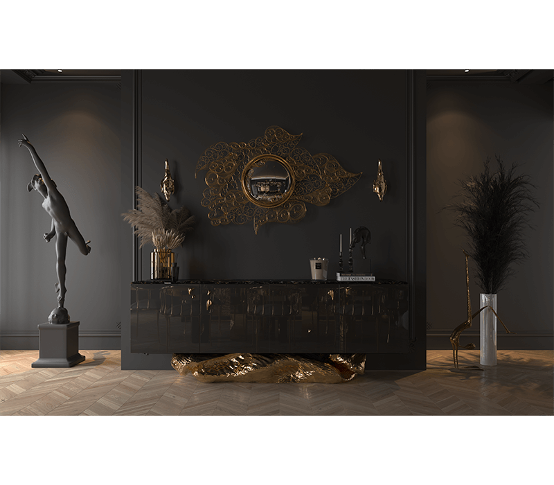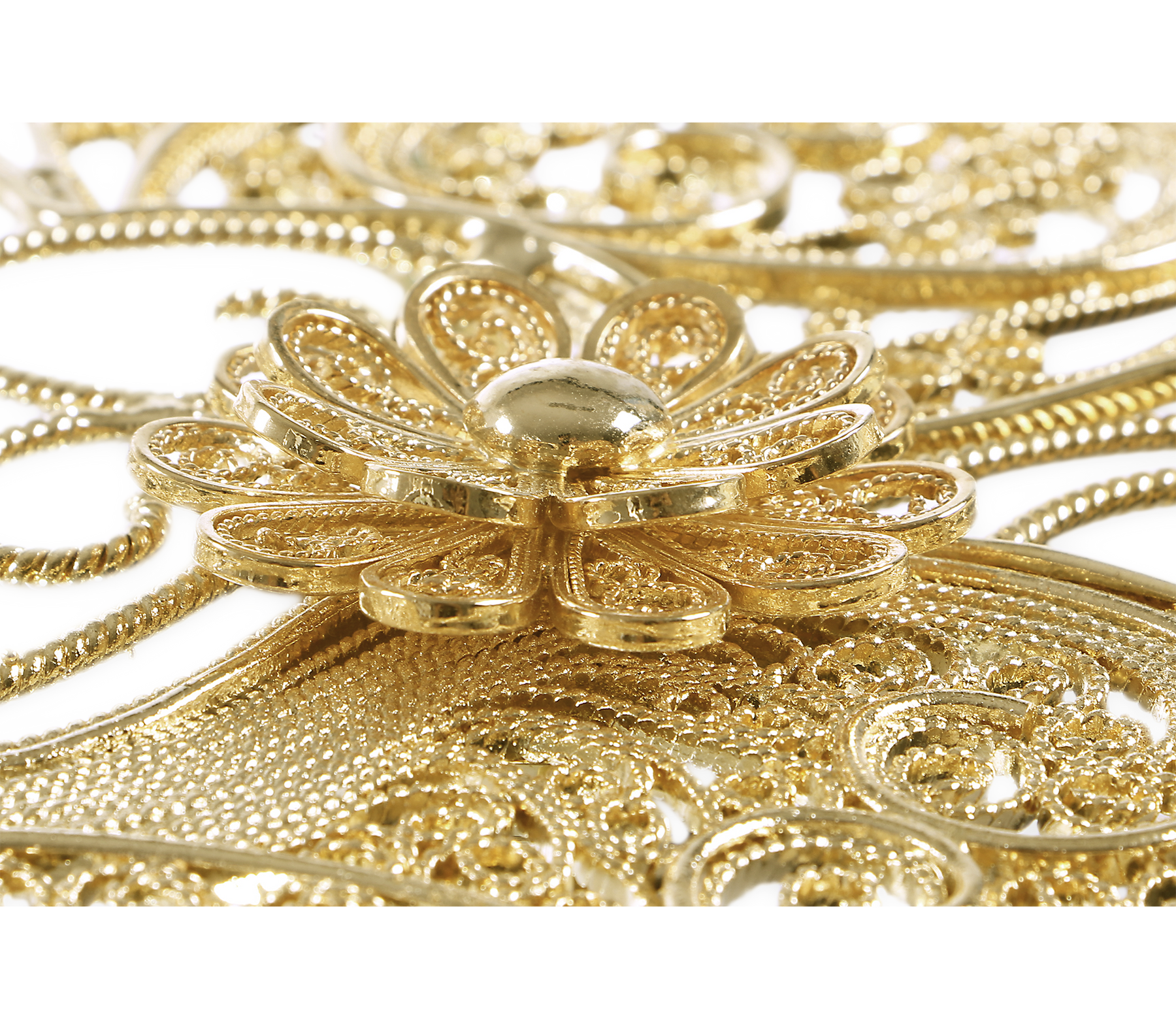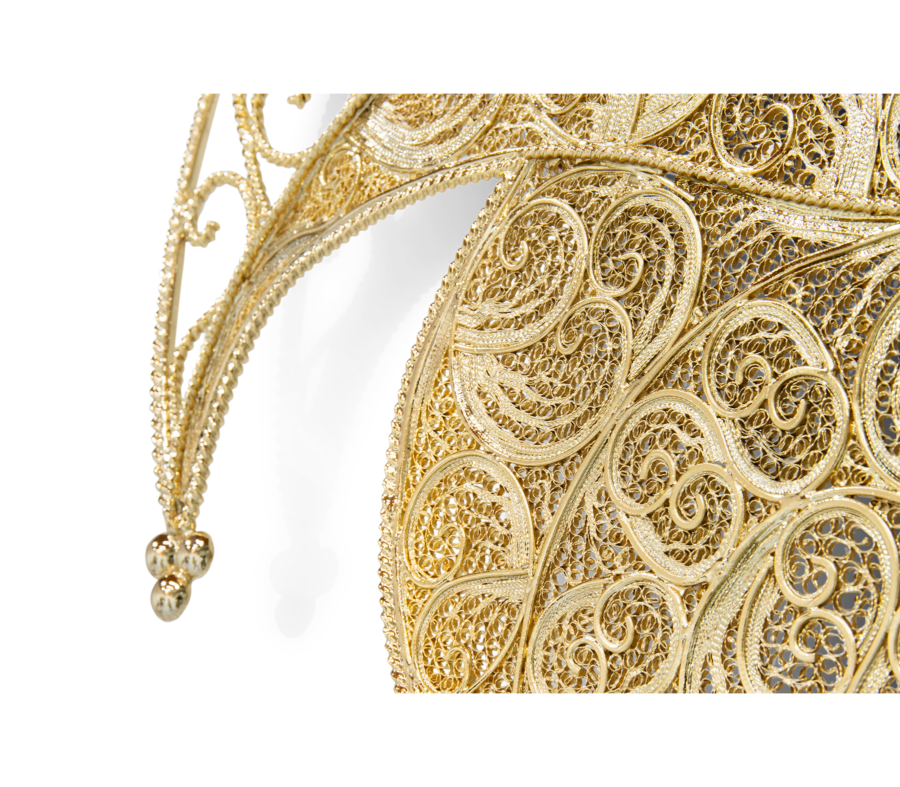 The Filigree Mirror resorts to one of the oldest jewellery making techniques known. Completely handcrafted, with each brass cord fitted with precision, the Filigree Mirror flourishes in a shape traditional to Portuguese culture and art. A true work of art, this luxurious mirror plays tribute to Boca do Lobo's core values heritage and craftsmanship. The Filigree mirror's structure is made from brass cords, gilded in 18k gold. It features a brass sheet that is hand-hammered to achieve its concave shape. A jewelry technique used to solder tiny beads and twisted threads. Filigree is the most delicate technique used to work precious metals, usually of gold and silver. It is an age-old and detailed jewelry expression in which skilled artisans painstakingly solder tiny beads and twisted threads to create striking artistic motifs, suggesting often exquisite and intricate lace-like patterns.