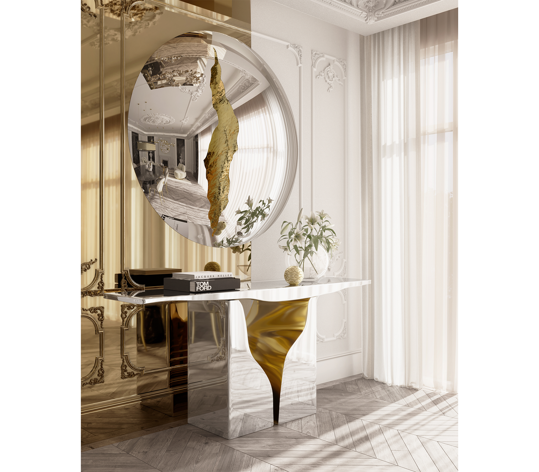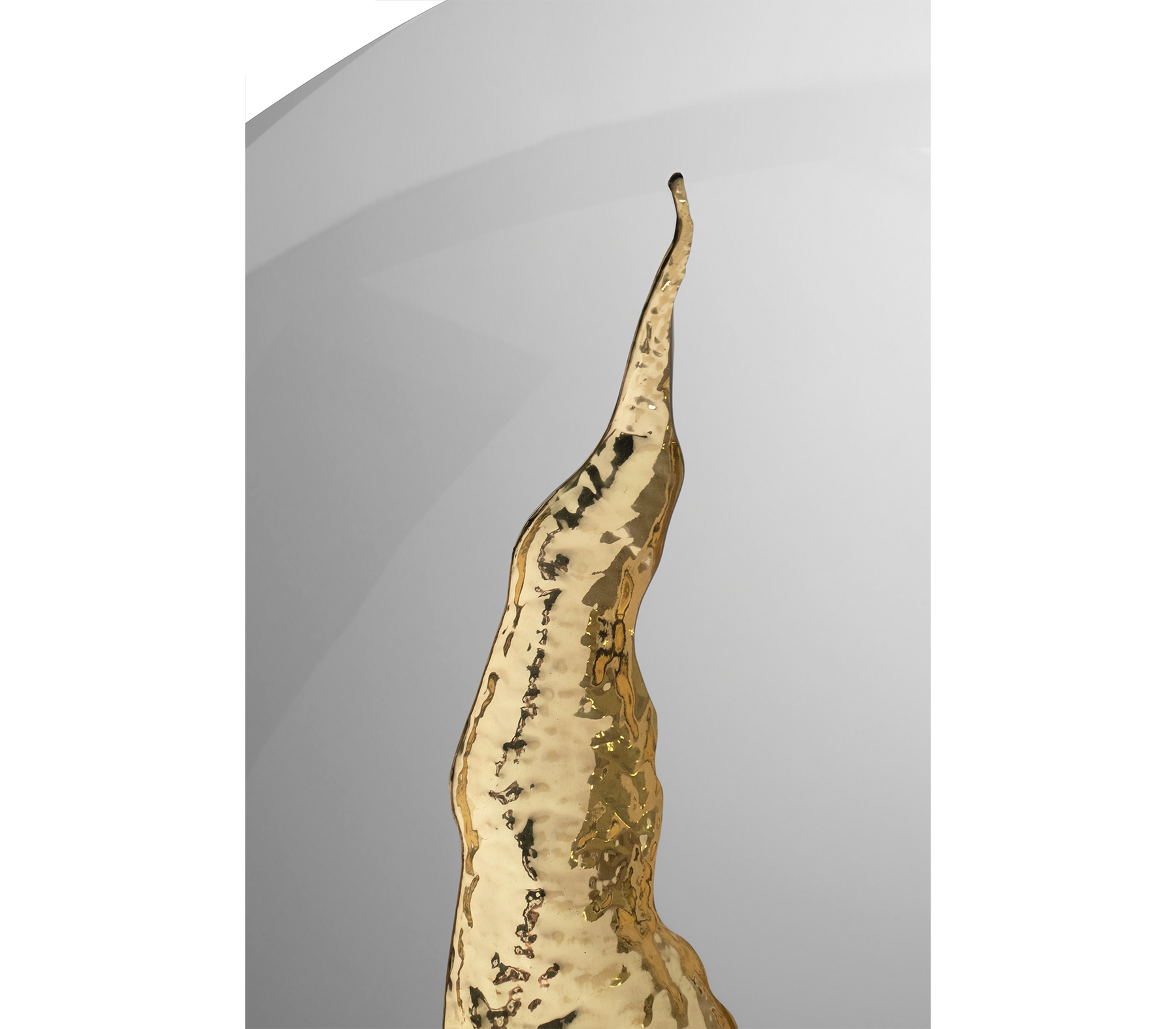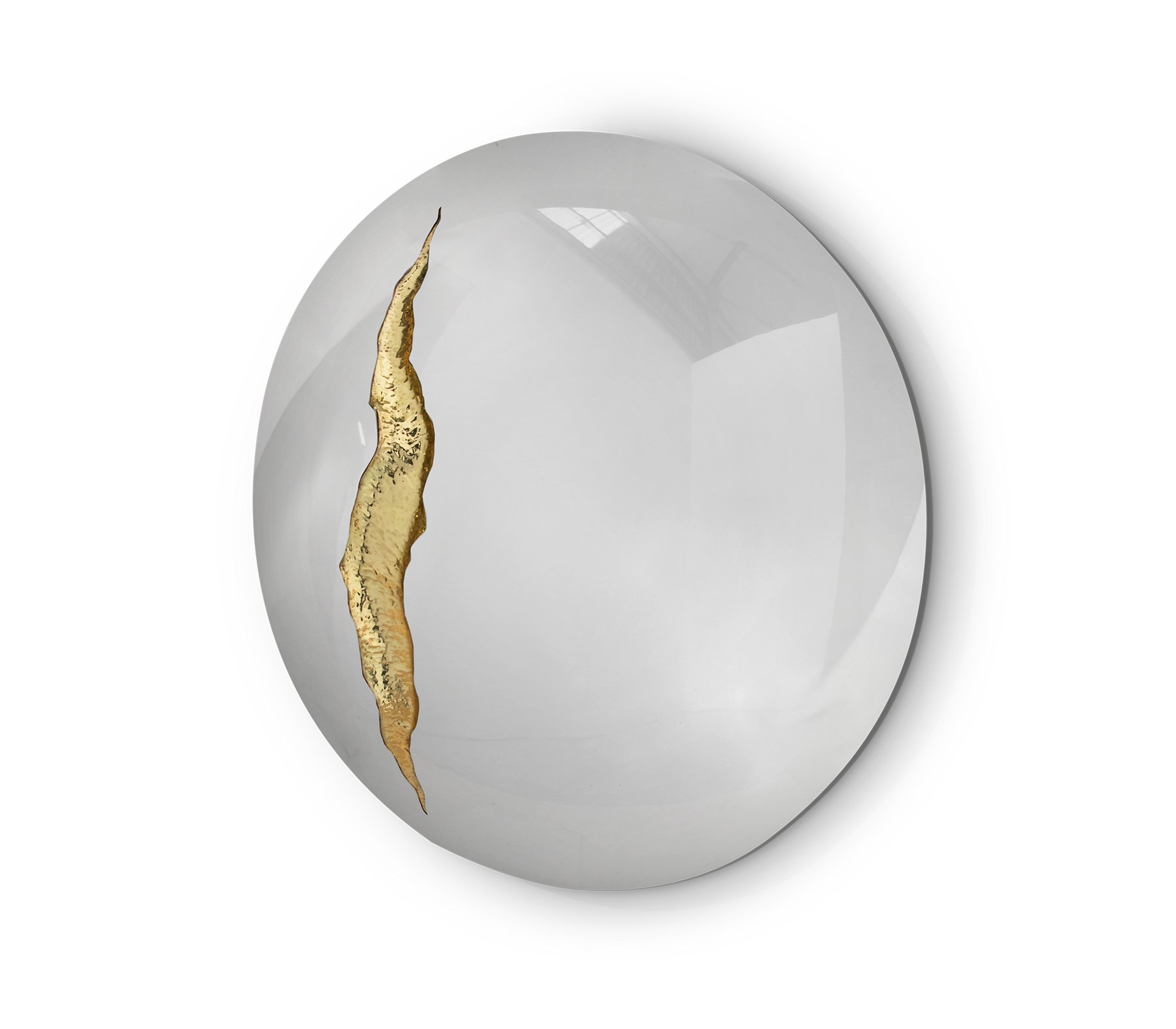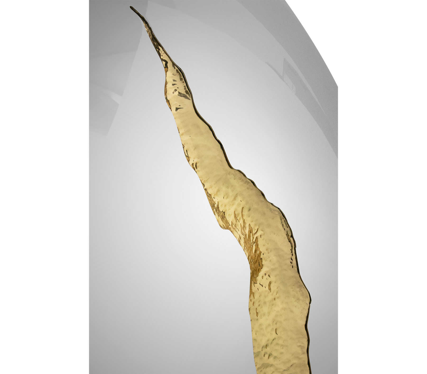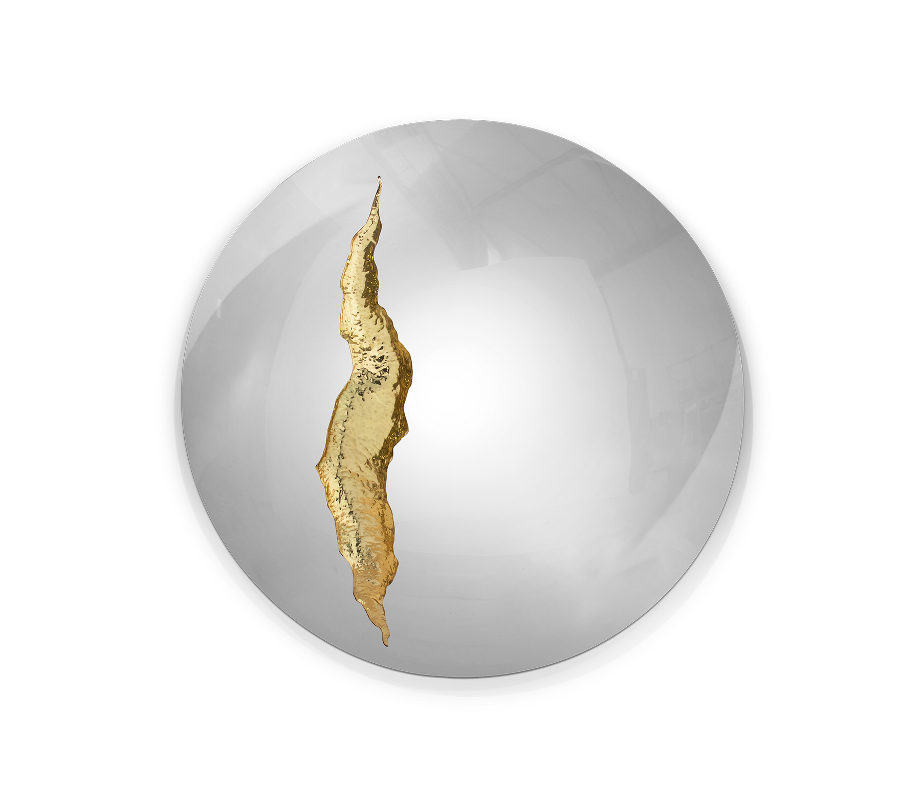 The organic features of this large mirror are achieved through the manual fitting of golden polished brass, finishes in polished stainless steel. The hammered gold details and the mirrored façade conveys a beautiful duality between power and refinement to bring a new contemporary verve into interior design. A functional artwork piece born from cold and freshly cracked to showing off the world rich, golden details.