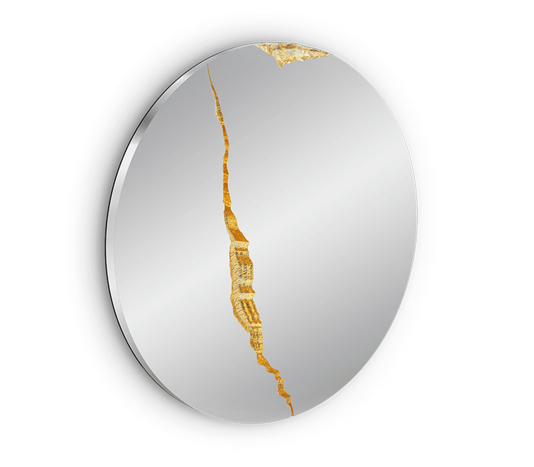 Wooden structure, with a mirrored surface with two polished stainless steel plates, in circular format ripped by a hammered polished brass sheet. LED lighting strip bursts around the whole body.
