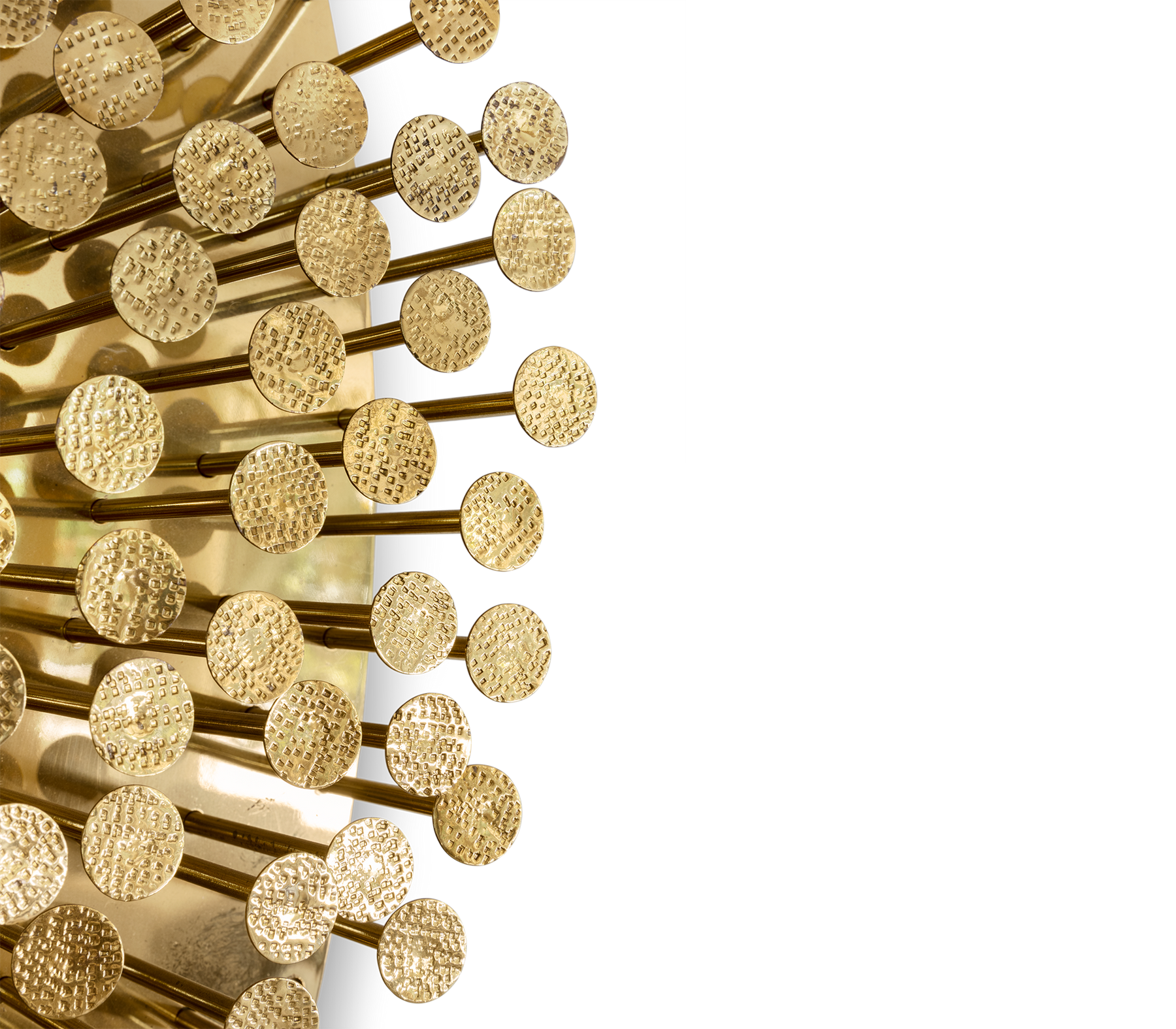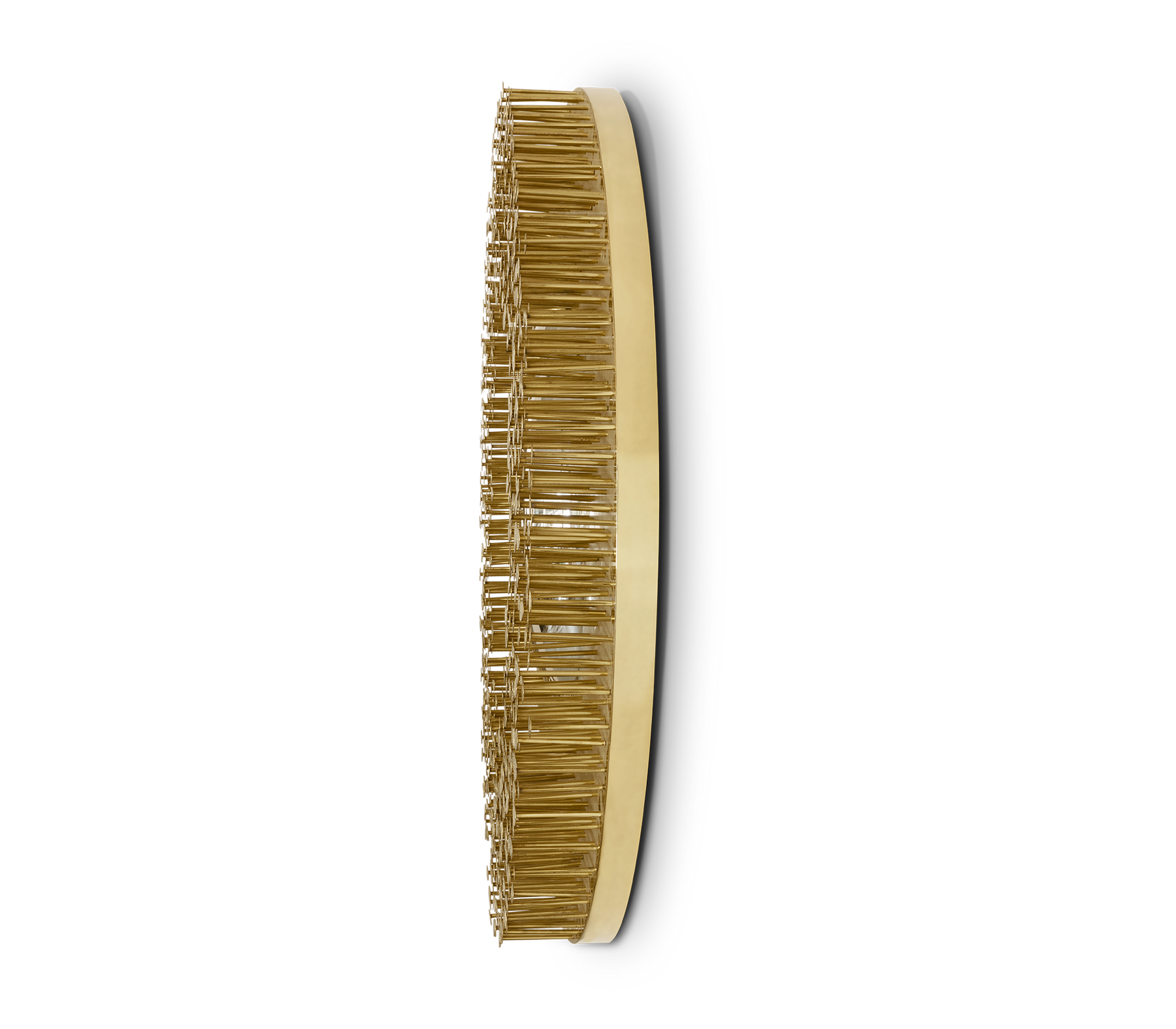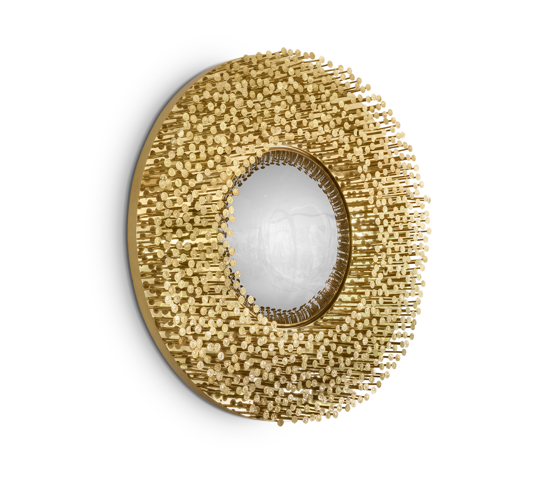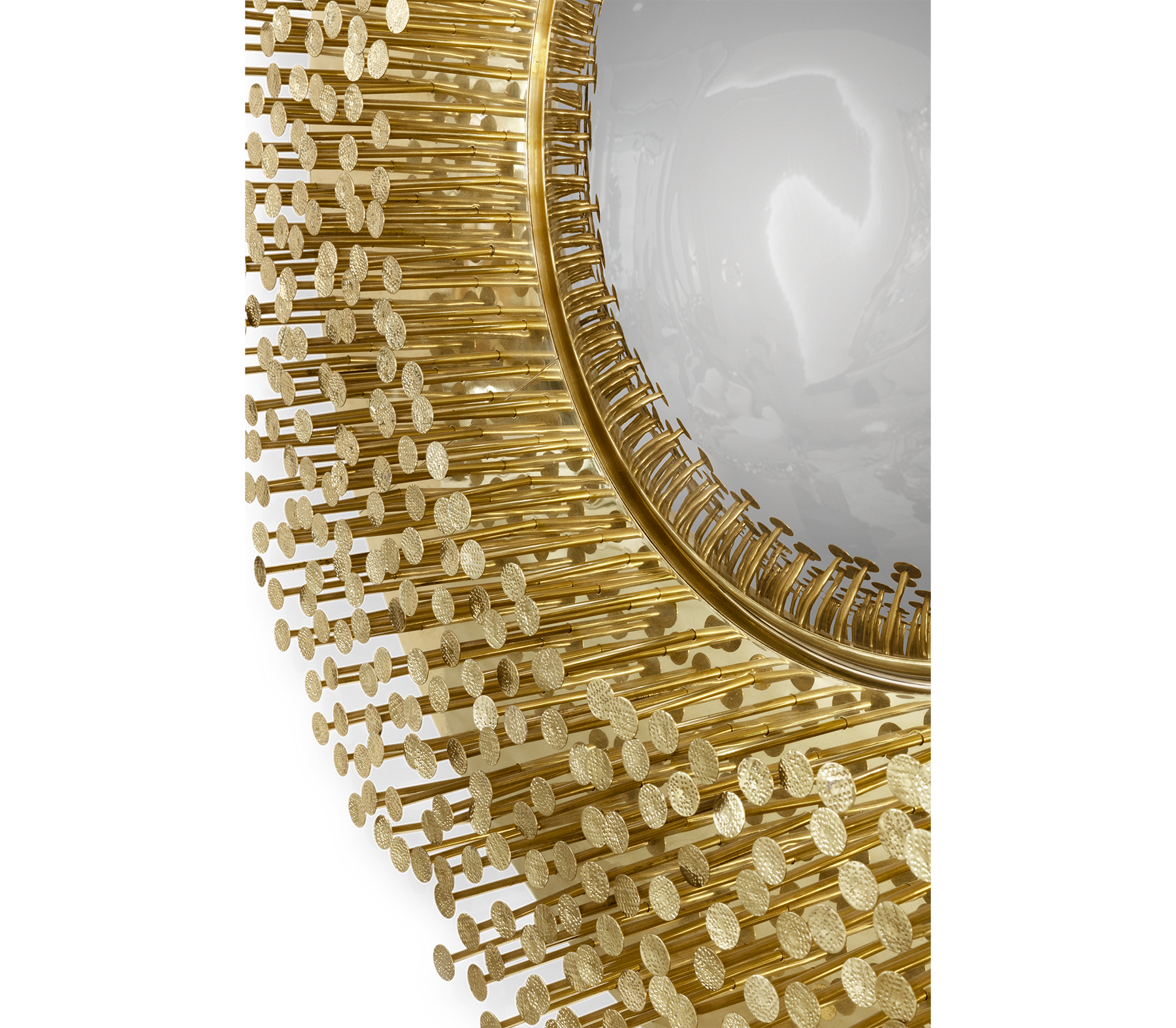 From the legend born in the depths of Sherwood Forest, ROBIN Mirror embodies the strength and character of noble ages, giving them a modern approach. By honoring the history of one of the best archers in English literature, this wall mirror was given a strong visual texture through the use of handmade nails, each one unique in its finishing, size and character. The fish-eye mirror is supported by a brass structure that turns ROBIN into one of the most emblematic pieces of the entire collection.
