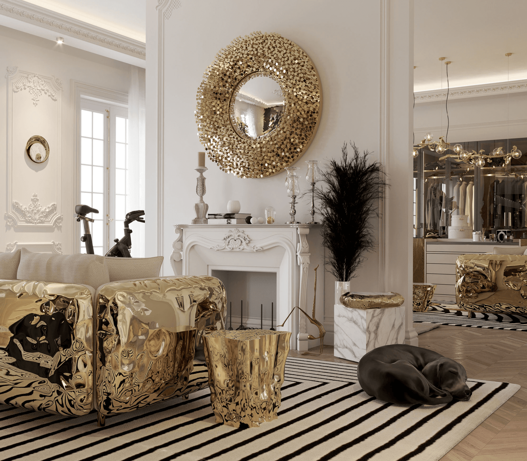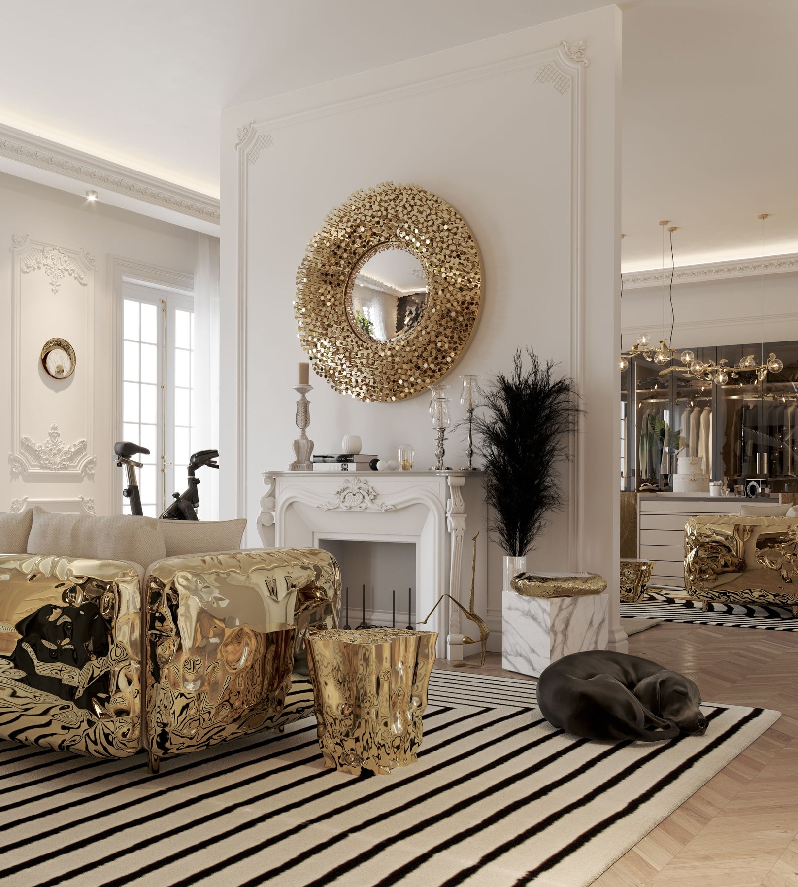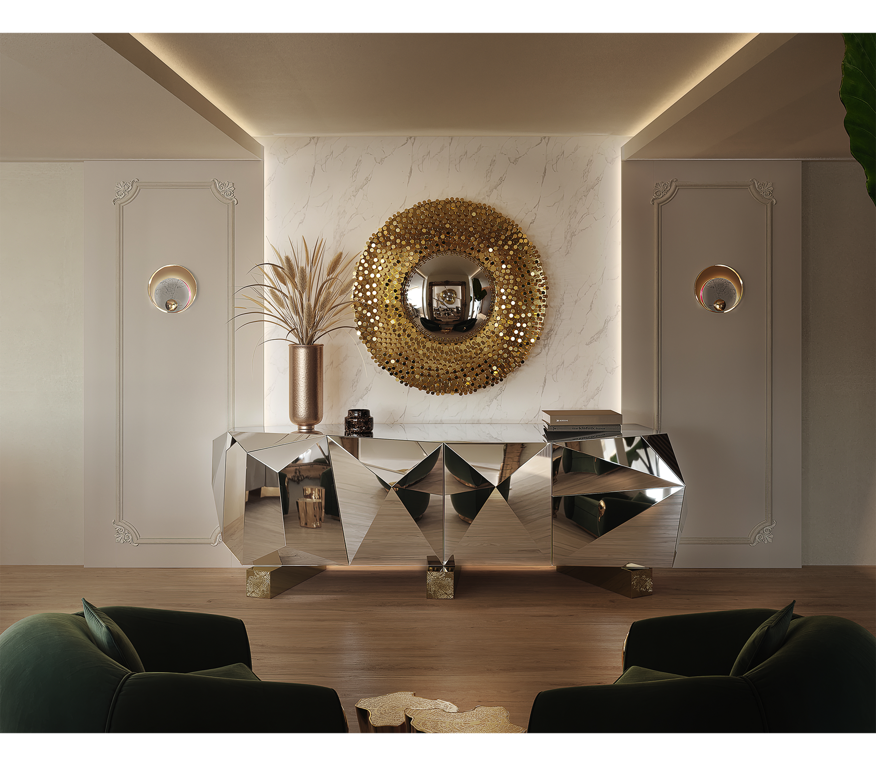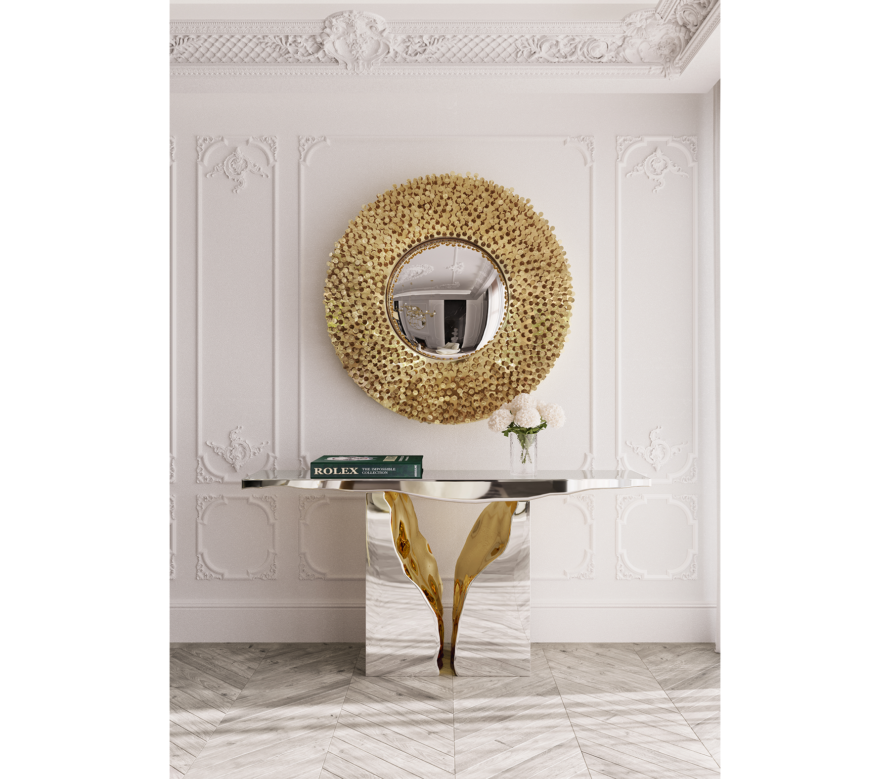 From the legend born in the depths of Sherwood Forest, ROBIN Mirror embodies the strength and character of noble ages, giving them a modern approach. By honoring the history of one of the best archers in English literature, this wall mirror was given a strong visual texture through the use of handmade nails, each one unique in its finishing, size and character. The fish-eye mirror is supported by a brass structure that turns ROBIN into one of the most emblematic pieces of the entire collection.