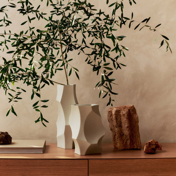The Cueva Vase from Ferm Living, a sculptural masterpiece, is inspired by the breathtaking beauty of cave formations. Its organic curves and textures, crafted from ceramic with a glazed finish, add unique character to any interior. The solid, substantial feel and smooth, reflective surface make it a stunning addition to your home decor.