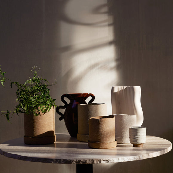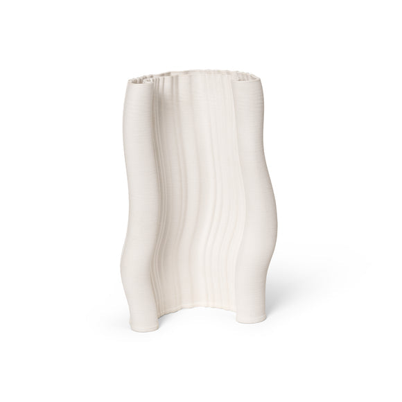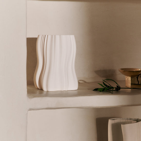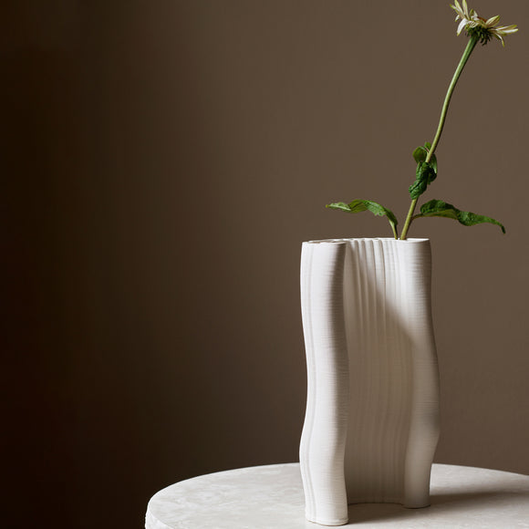 With a name derived from the French word for ’watered’, a moiré pattern represents a graphic effect that occurs when the organic and geometrical clash. The Moire Vase has been created through a process of 3D printing clay, resulting in thin layers which have gradually formed a subtle pattern across the body of the vase, revealing its digital origins. Use it to display your favorite seasonal flowers or branches, or let it make a statement all on its own.