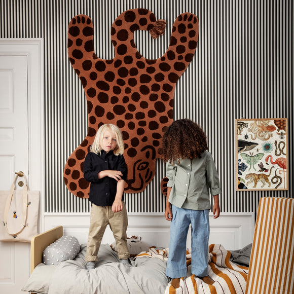 A new friend and a soft rug for the kids’ room. The tufting of this rug in the shape of a leopard makes it soft and fluffy. As the new favorite place to play or the spot for a spontaneous nap, this rug will be the foundation of new adventures in the kids’ room.
