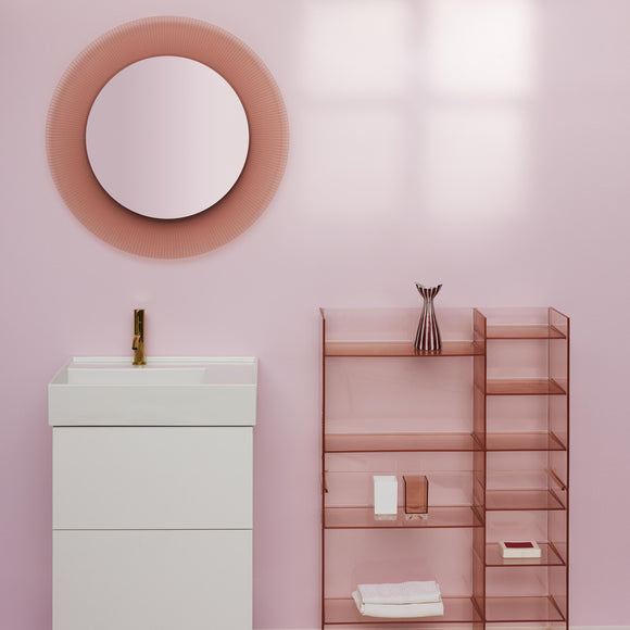 A round in mirror in a frame with a pleated effect which when lit creates a suffused play of refractions. A well-defined graphic touch that evokes a heritage connotation and takes its inspiration from one of the most ironic pieces in the Kartell collection: the Bourgie Lamp and its unmistakable Baroque style. The chance to switch from transparencies to the chrome-plated gold and silver models on offer makes this mirror an extremely versatile and adaptable design piece able to create contemporary and essential settings or eccentric and outside the box environments.