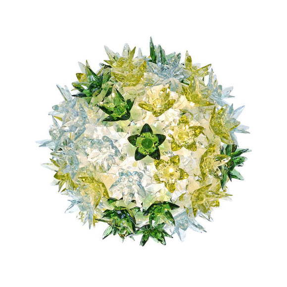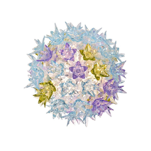 How do you like the idea of having a floral arrangement above the table? The Bloom New lamp family with its elliptical shape and its distinctive original structure covered by sparkling polycarbonate flowers as pure and precious as crystal comes in three different sizes with various functions - hanging, wall or ceiling fixture. As delicate as a spring bouquet, the Bloom lights offer new and sophisticated multi-color nuances in lavender and mint or an elegant transparent white monochrome. A series of little lights located within the frame beams the light shafts through the flowers to refract on the faceted surfaces of the petals and multiply a thousand reflections.