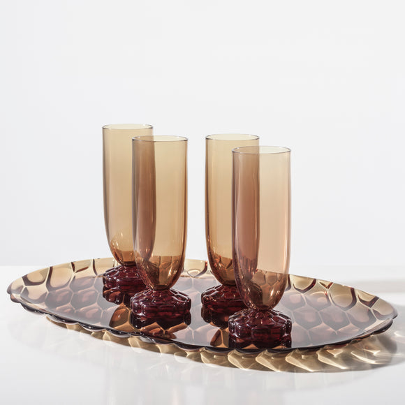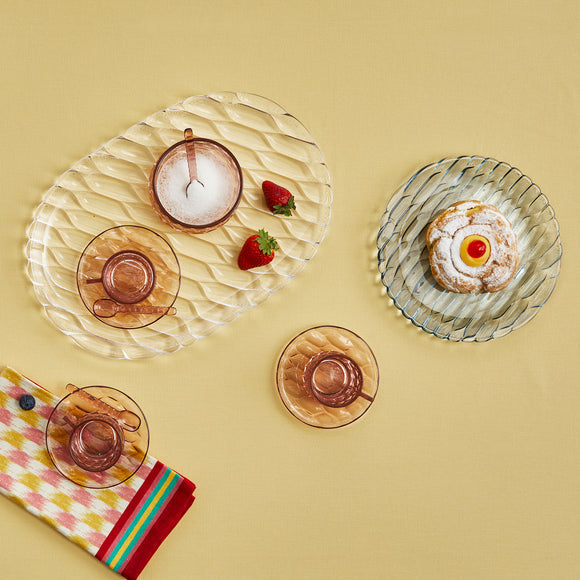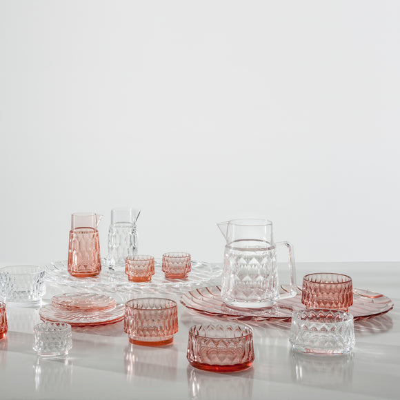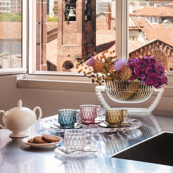 A comprehensive line of plates, trays, glasses, bowls, carafes, coffee cups and sugar bowls. The line's individuality is down to the fact that each model presents a different pattern inspired by the moulds that were once used for making jellies. The overlapping sections and colourful juxtapositions create an imaginative yet discreet ensemble that is both creative and sophisticated.