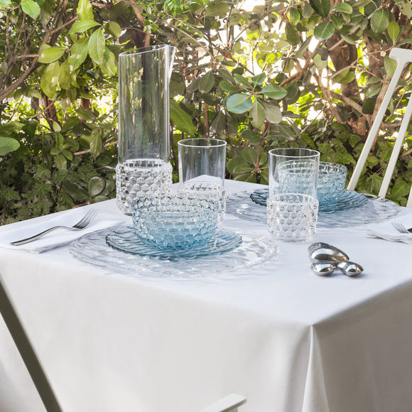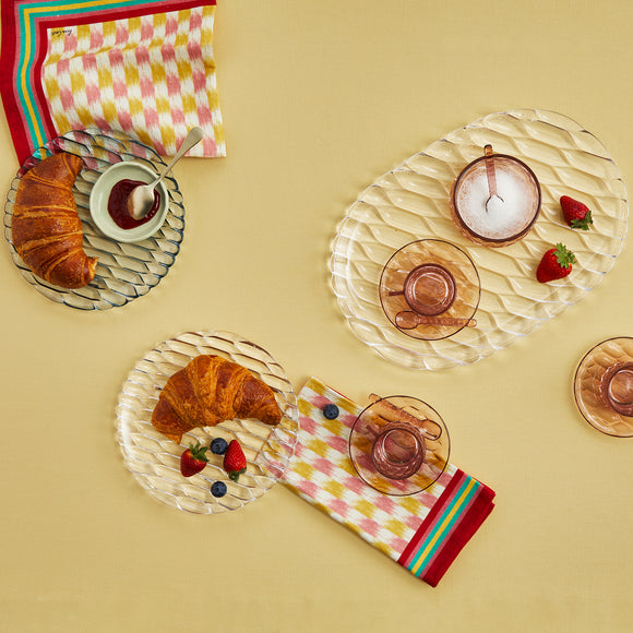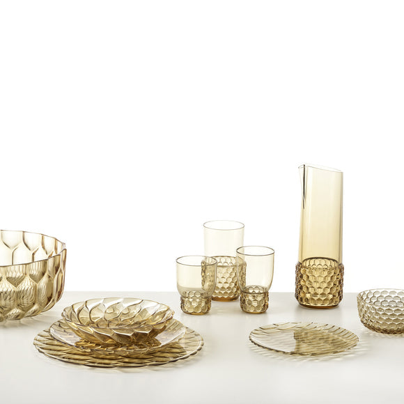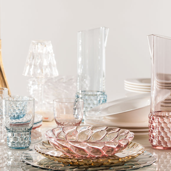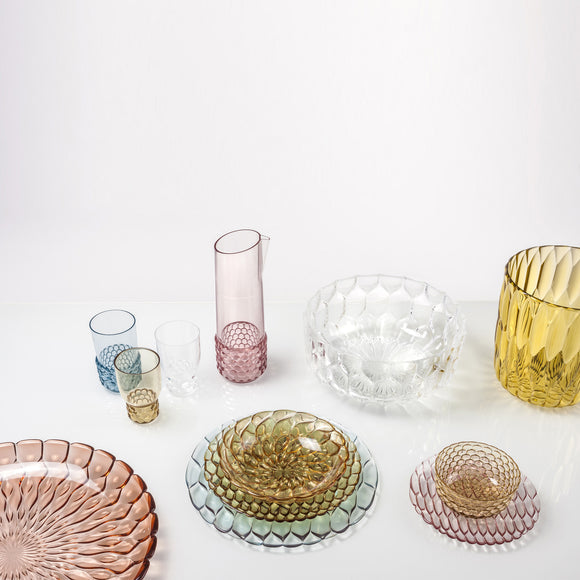 A comprehensive line of plates, trays, glasses, bowls, carafes, coffee cups and sugar bowls. The line's individuality is down to the fact that each model presents a different pattern inspired by the moulds that were once used for making jellies. The overlapping sections and colourful juxtapositions create an imaginative yet discreet ensemble that is both creative and sophisticated.