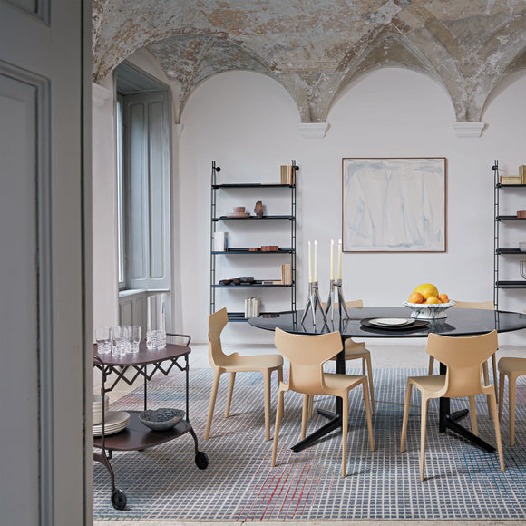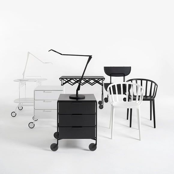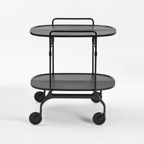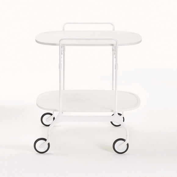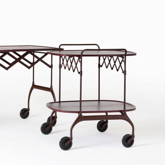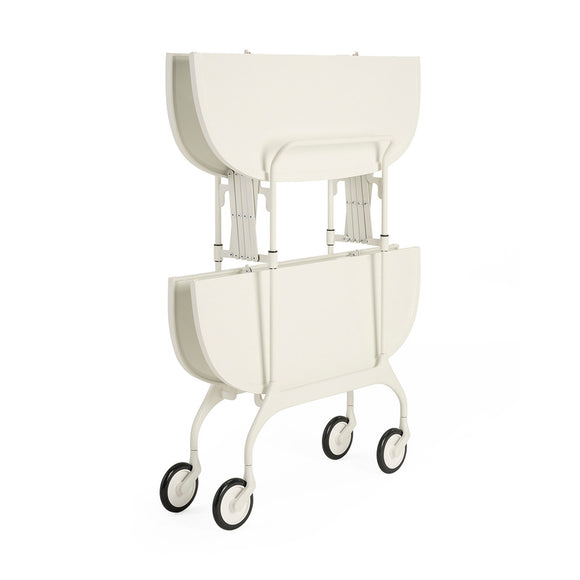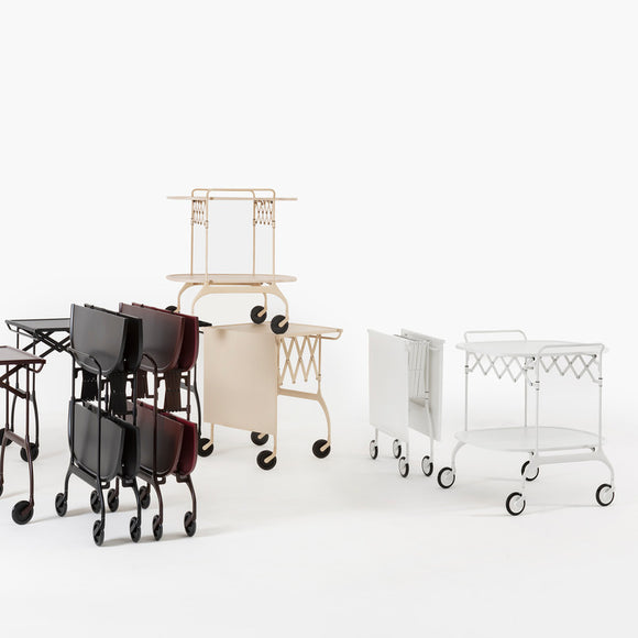 30 years old but still unique. Antonio Citterio’s genially designed best-selling trolleys are also presented with a new matte and soft touch texture, more attractive and more practical than ever. Available in white, cream, bordeaux and black. Folding, extensible “dumb waiters”, ideal for buffets and cocktail parties, or as small occasional tables.