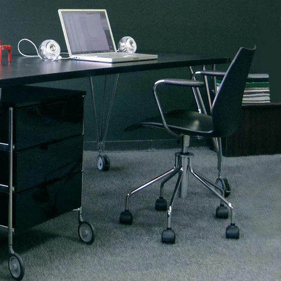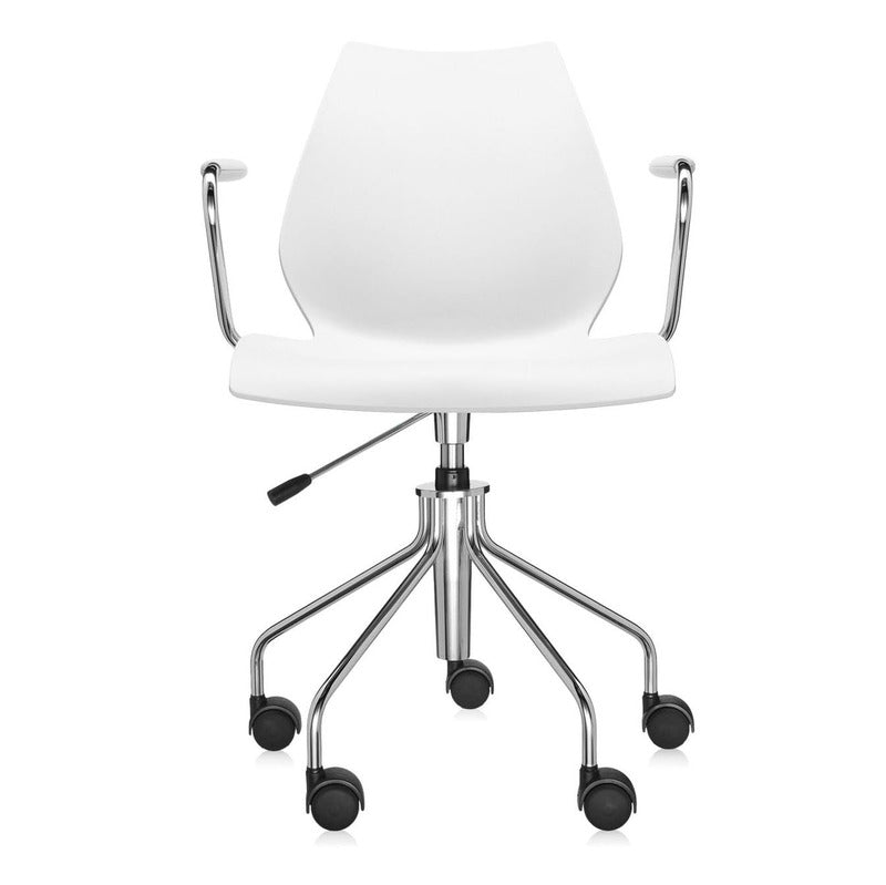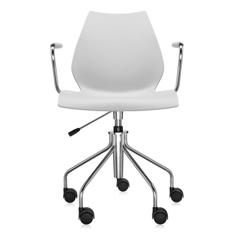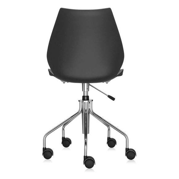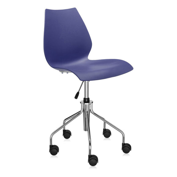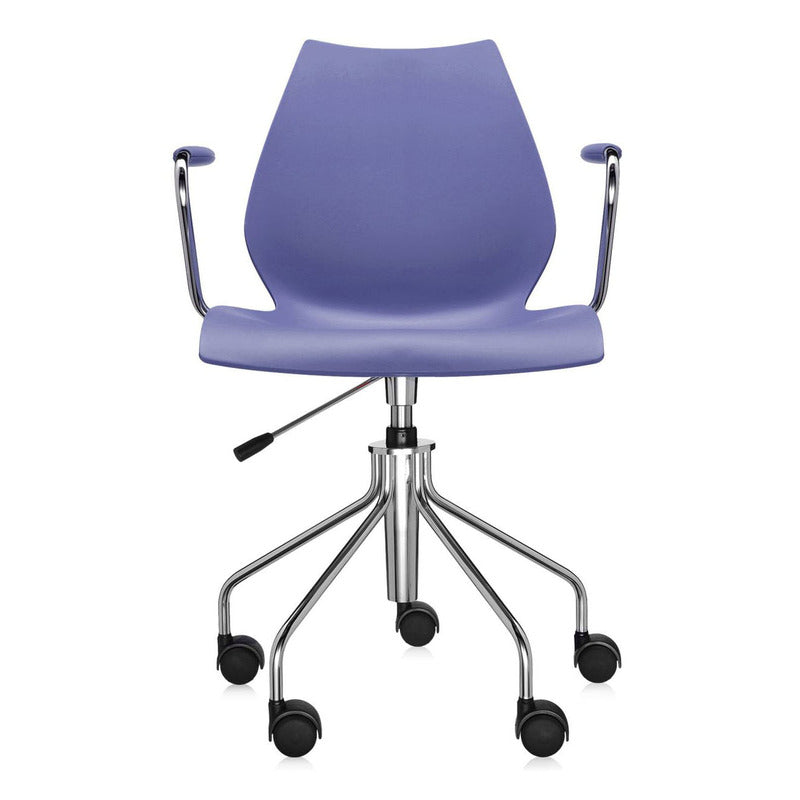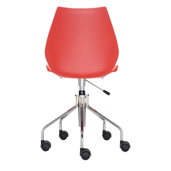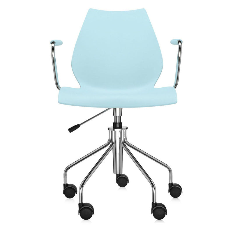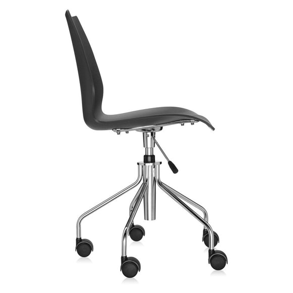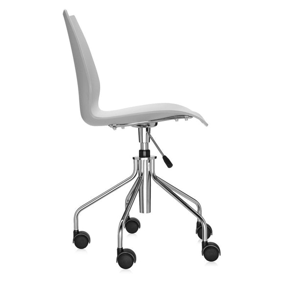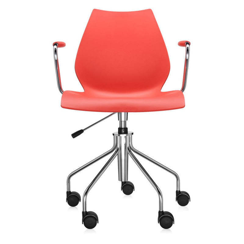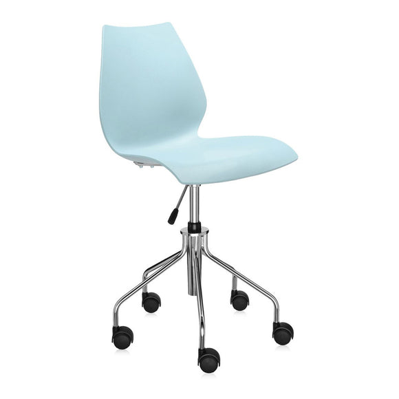 Another member of the Maui family is the version of the small armchair on casters available with pump and with or without arms. The polypropylene seat is fixed onto a chromed steel structure, and the castors are fixed to a base of chromed steel which branches out into five legs. Maui on wheels is the ideal solution for the informal office and the home office, due to its lightness and comfort.