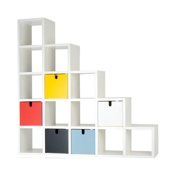 Suitable for home or office, the bookshelf system includes a cubic container, available in various colors. The cube, a useful and colorful bookshelf accessory, can also be used as a stand-alone container for storing toys, clothes and other objects.