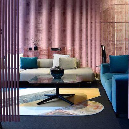 Multiplo is a large family of tables, versatile in its uses, and designed for customisation by playing with its shapes (rounded square, round and oval) and pairing of bases (central base with two, three or four spokes) and tops (solid color stoneware or marble and glass finish). To the collection are added the low table Multiplo Low models 16.9 inches in height. Two versions enrich and complete the line and give offer the possibility to partner the tables with the living area sofas. The dining (or office) tables have also been given new dimensions, with 90.6 inches for the rounded rectangular shape and 53.2/63 inches in diameter for the round shape.