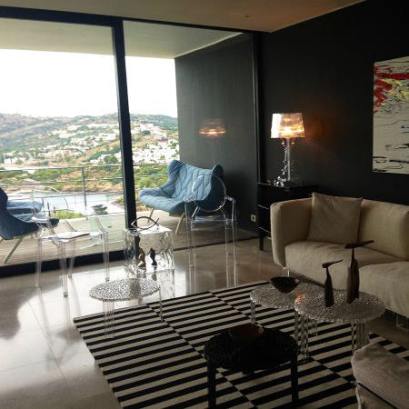 This faceted cube is an exciting object with its transparent or mirrored parts that create a special reflected atmosphere. Made in PMMA, Optic is a container cube which comes in two versions: closed with a door or open without door. Its surface is strikingly decorated with square based pyramids which, whether transparent or mirrored, create a strong visual impact. Optic measures 16 x 16 x 16 inches, and offers a myriad of potential combinations by placing the cubes next to each other, stacking them or creating linear compositions. Depending on quantity and arrangement, they can charmingly fulfill a wide variety of needs.